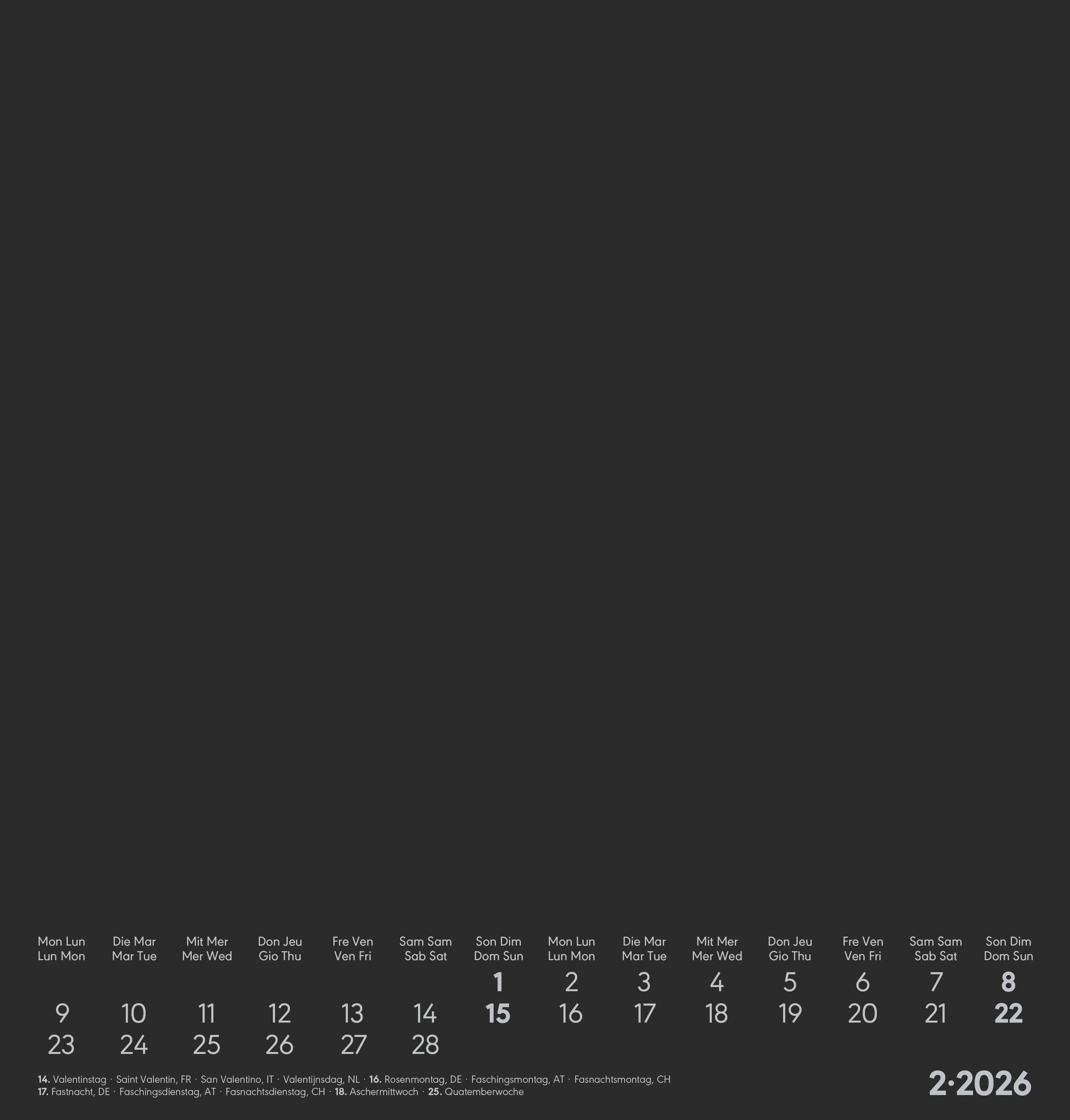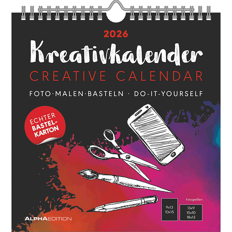 Gestalten Sie Ihr Jahr ganz persönlich mit dem Alpha Edition Kreativ-Kalender Schwarz 2026 im handlichen 21×22 cm Format. Der elegante schwarze Hintergrund mit weißer Schrift bringt Fotos, Zeichnungen und Collagen perfekt zur Geltung und verleiht Ihrem Kalend...