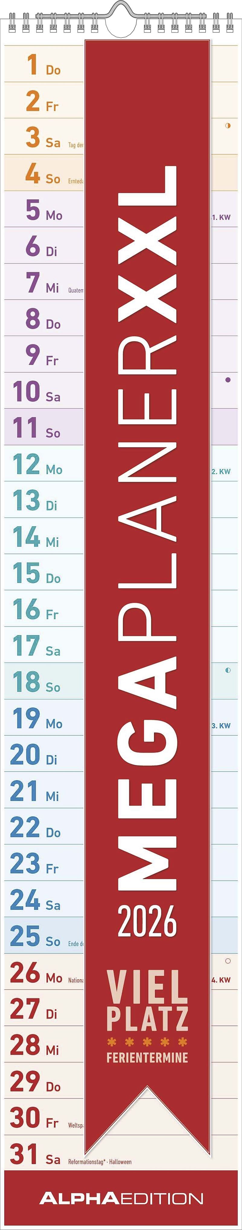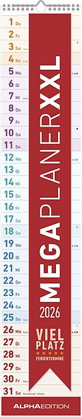 Der Megaplaner XXL 2026 von Alpha Edition ist der extragroße Streifenkalender für alle, die maximale Übersicht und viel Platz für Notizen benötigen. Mit neutralem Design, farblich abgesetzten Wochen und praktischen Ferienterminen ist er ideal für Küc...