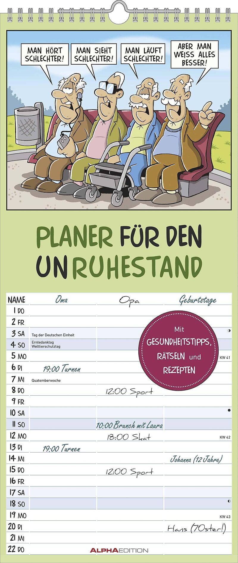 Der Planer für den Unruhestand 2026 von Alpha Edition ist der humorvolle Alltagsbegleiter für Senioren und Familien. Mit seinen bunten, witzigen Cartoons von Dirk Pietrzak bringt er Monat für Monat gute Laune an Ihre Wand und sorgt gleichzeitig für Ü...