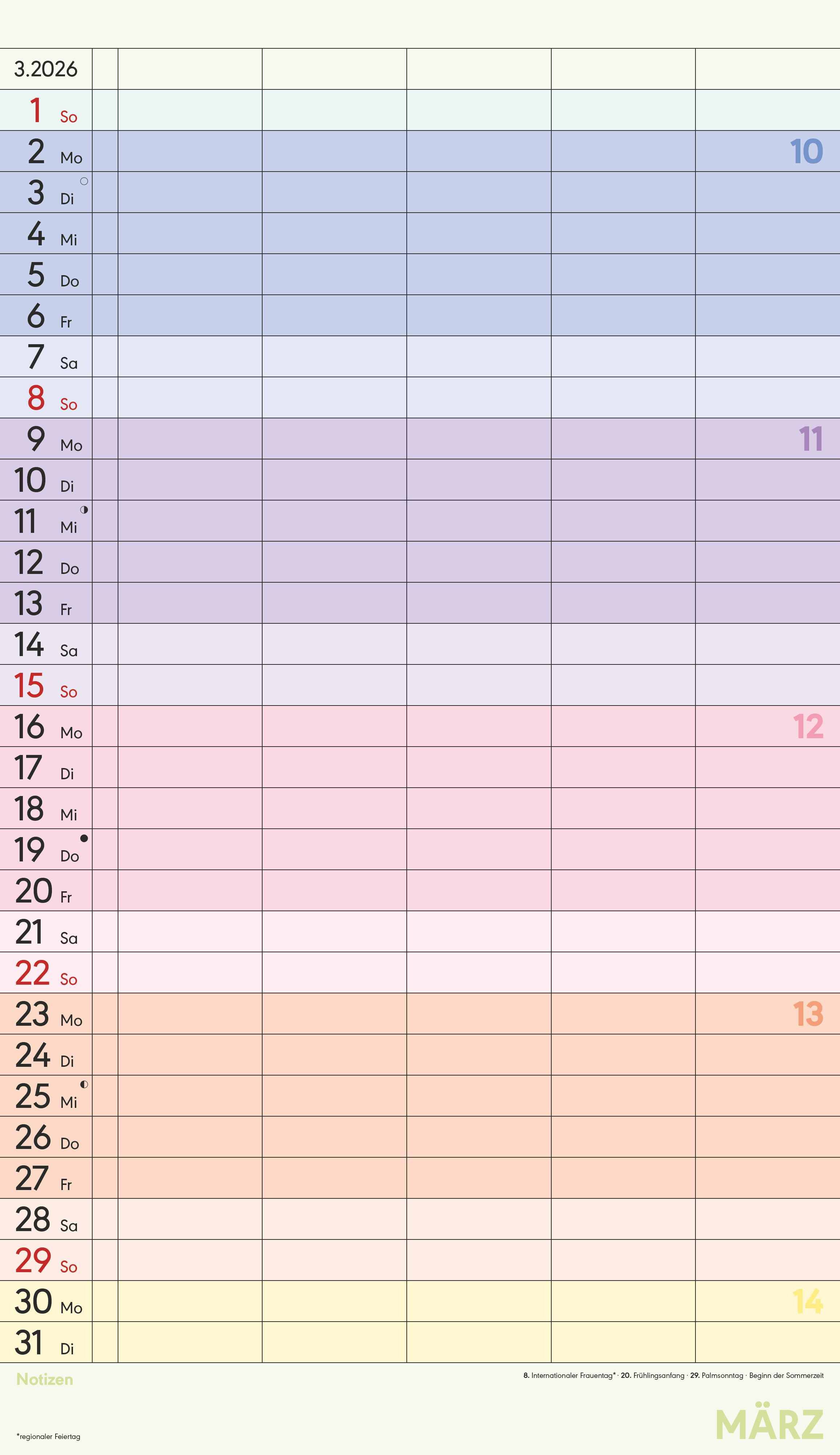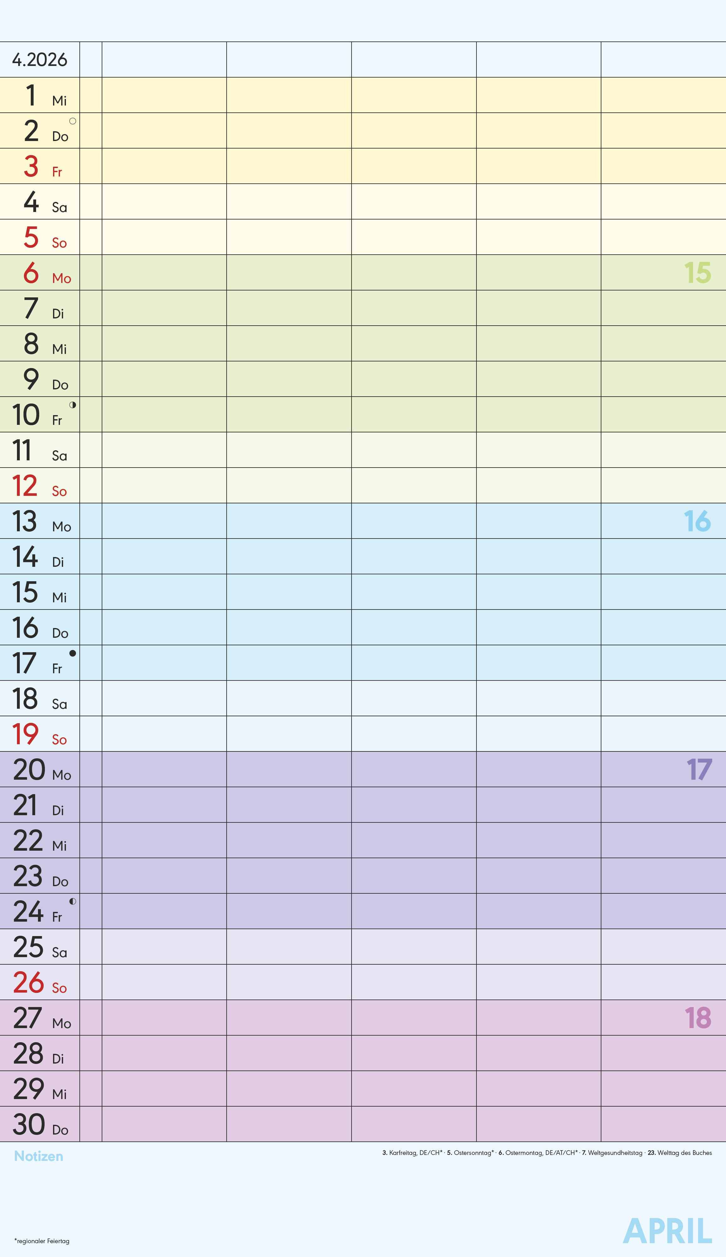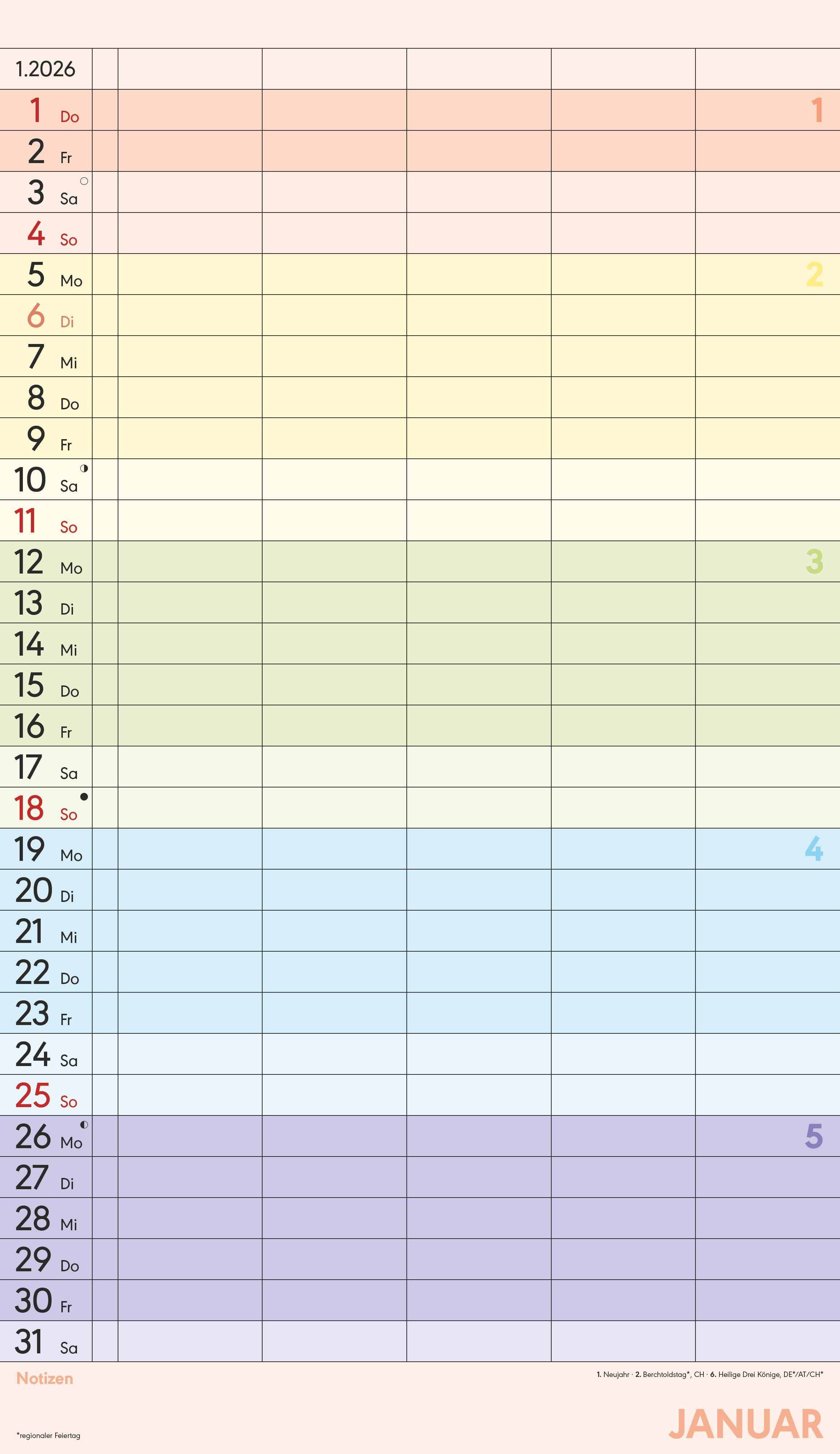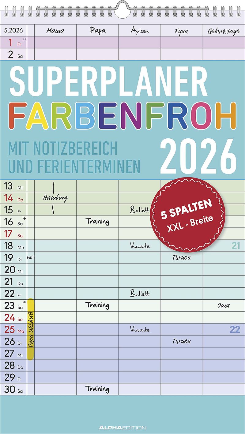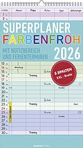 Der Superplaner Farbenfroh 2026 von Alpha Edition ist der perfekte Familienkalender, um den Alltag übersichtlich zu organisieren. Mit fünf Spalten, zusätzlichem Notizbereich und farbenfrohem Design behalten Sie alle Termine im Blick vom Schulausflug bis zum S...