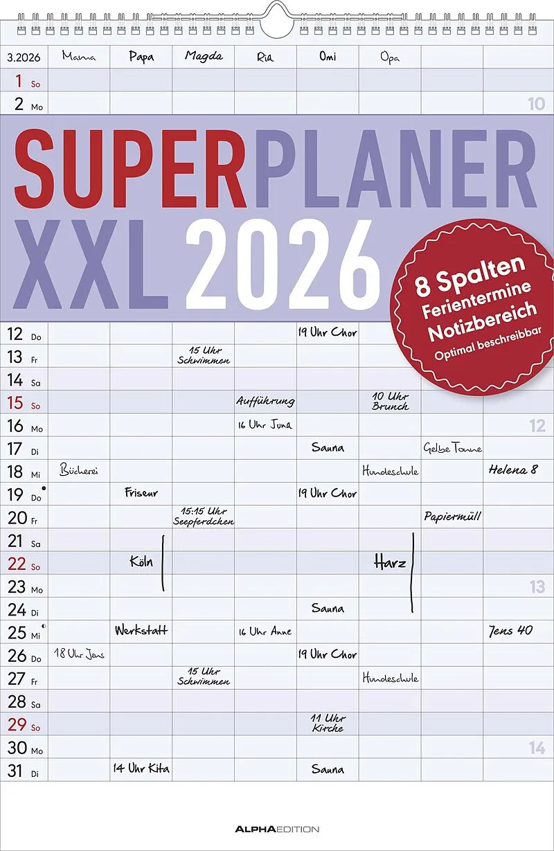 \n Der Superplaner XXL \n 2026\n von Alpha Edition ist der ideale Wandkalender für alle, die viel Platz für Termine brauchen. Mit acht Spalten, zusätzlichem Notizbereich und extra großem Format eignet er sich perfekt für große Familien, Teams oder Vereine.\n ...
