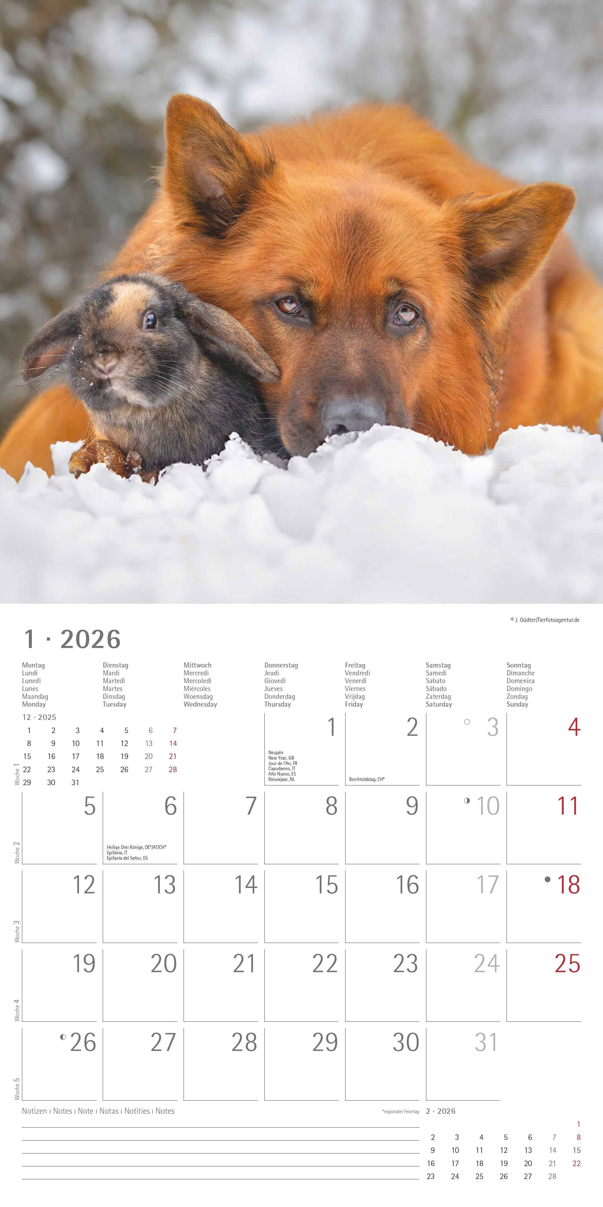 Der Tierfreundschaften 2026 Broschürenkalender bringt Monat für Monat herzerwärmende Motive tierischer Freundschaften an Ihre Wand. Von ungleichen, aber unzertrennlichen Tierpaaren bis zu liebevollen Szenen dieser Kalender zaubert täglich ein Lächeln ins Gesi...