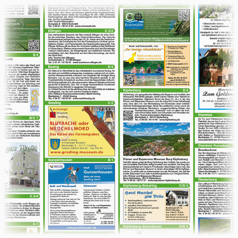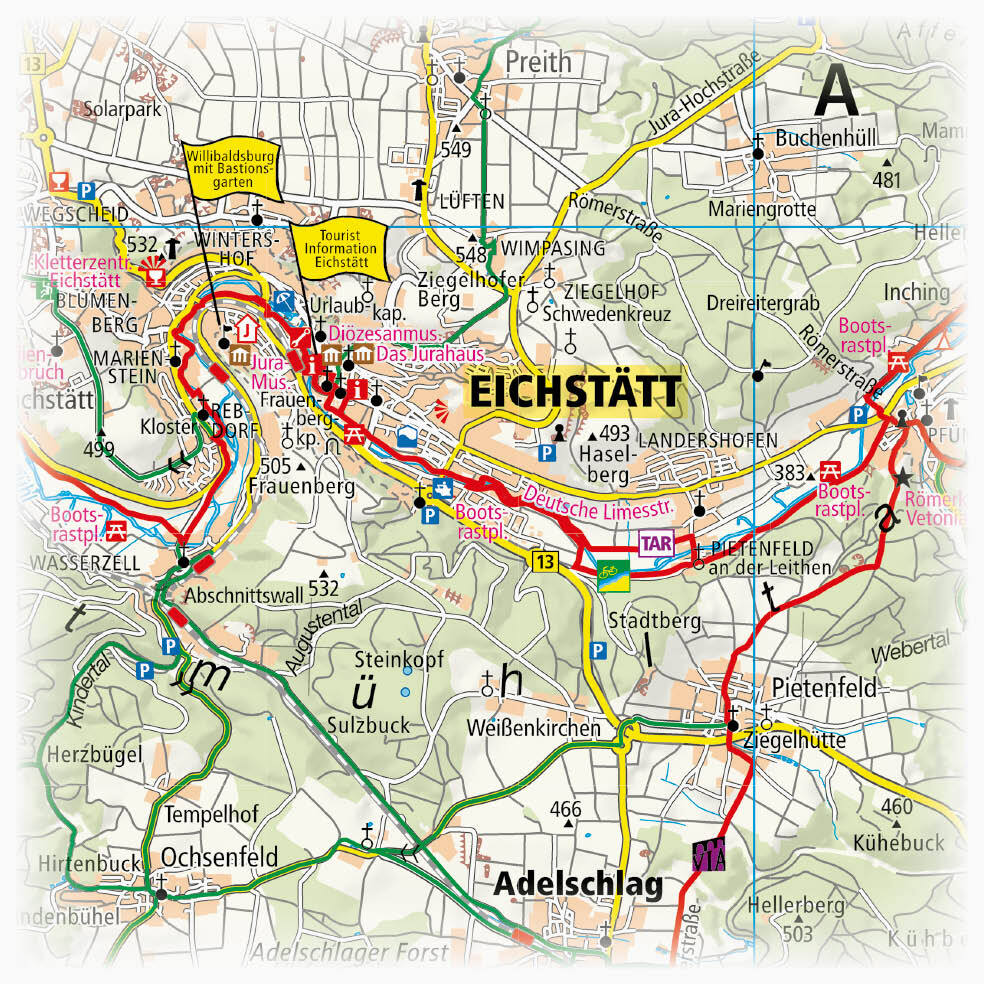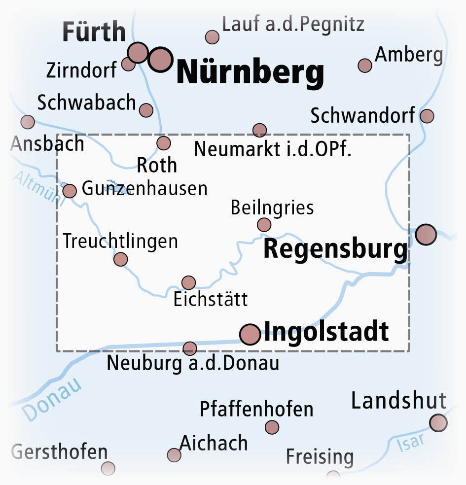 Die Altmühl, Donau und der Main-Donau-Kanal durchziehen den Kartenausschnitt der Radwanderkarte. An ihren Ufern führen Fernradwege entlang und queren so u. a. die Fränkische Alb. Einige Routen verbinden Altmühl und Donau und erfordern dabei Kondition der Aktiv...