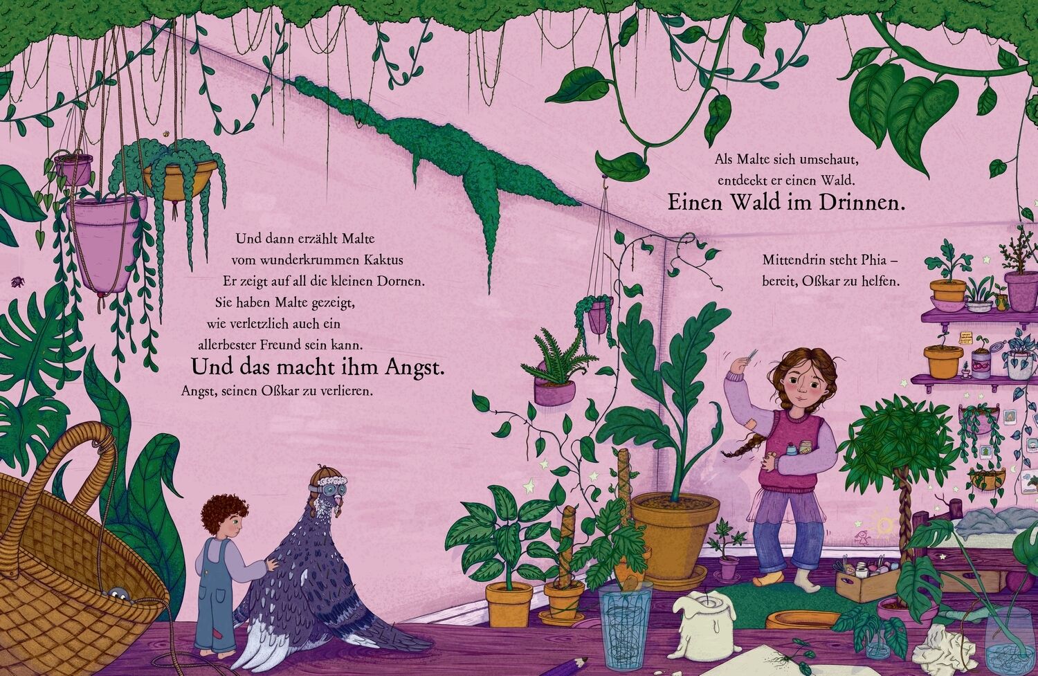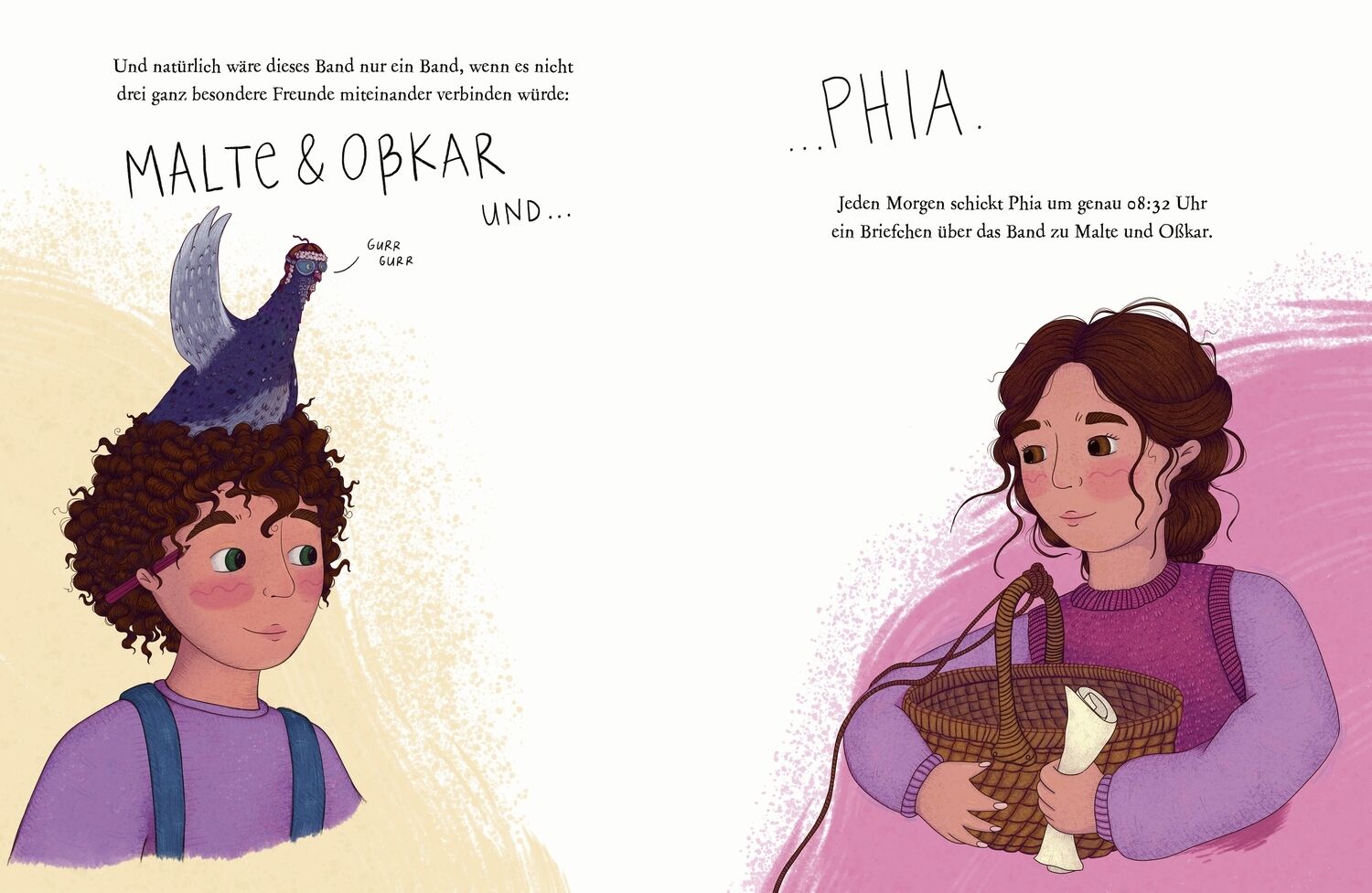 In einer Straße, inmitten von Straßen, schaukelt ein Körbchen sachte im Wind. Das Körbchen hängt an einem Band, gespannt zwischen drei ganz besonderen Freunden: Malte & Oßkar und Phia. Jeden Tag hüpft ein Brief über das Band. Und Glück. Doch als ein kleiner Unfall große Ängste weckt, beginnt für Malte und seinen Taubenfreund eine Reise in eine wahrlich wundersame Welt. Eine Welt, die leuchtet und glimmert, die wabert und flimmert. Es ist eine Welt, die von Abschieden erzählt und vom Für-Immer-Bleiben. Eine Welt, in der schon jemand auf sie wartet.