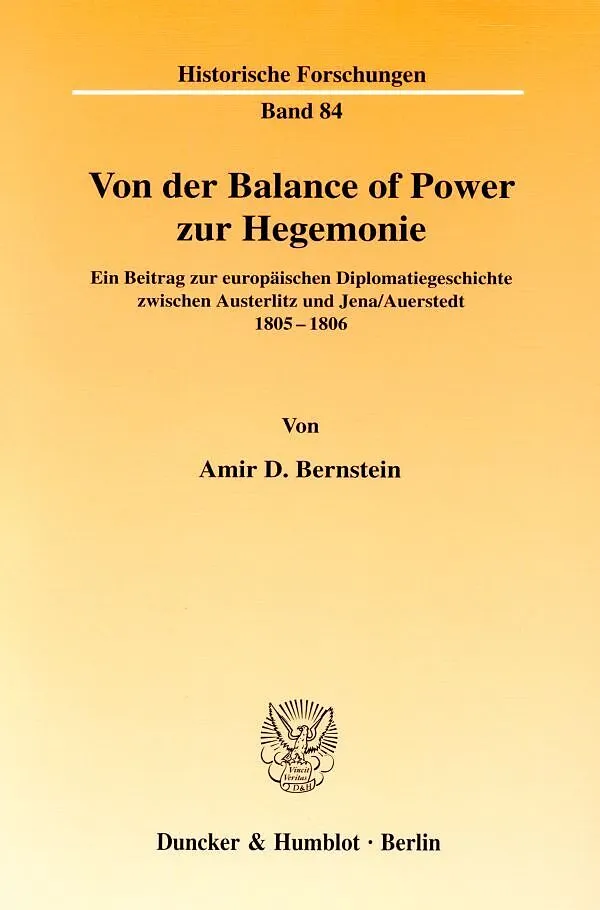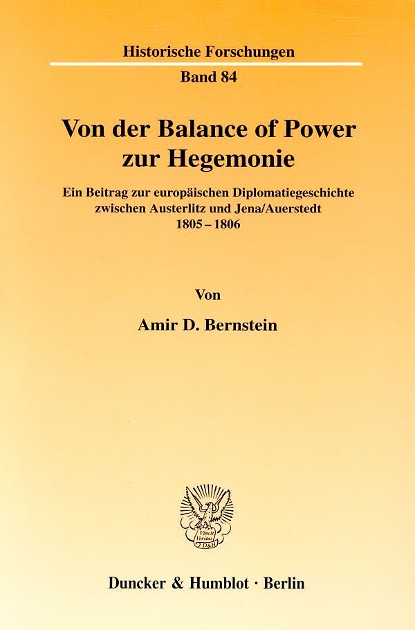 Inhaltsübersicht: Einleitung: Problemfeld und Methode - Forschungsstand und Quellenbasis - A. Historischer Hintergrund und Rahmenbedingungen: Zur Geschichte der europäischen Balance of Power - Die Akteure - B. Balance of Power oder Hegemonie: Die antifranzösische Koalition - Talleyrand, Napoleon und das europäische Gleichgewicht - Napoleons Friedensstiftung in Mitteleuropa - Preußen und die napoleonische Neuordnung - Exkurs: Spannungen in der Peripherie und auf dem Kontinent - C. Vom Rheinbund zu einer confédération du nord de l'Allemagne: Die Anfänge der europäischen Neuordnung - Exkurs: Zum Ursprung der norddeutschen Politik Preußens - Territorialpolitik: Preußen, Kurhessen und der Nordbund - Politisch-kulturelle Diskrepanz: Kursachsen, Preußen und der Nordbund - Handels- und Außenpolitik: Preußen, die Hansestädte und der Nordbund - D. Auf dem Weg zum Rétablissement?: Der Oubril-Vertrag - England, Talleyrand und die kontinentale Neuordnung - Vom Rétablissement zum Umbruch - Der Weg nach Jena - Von der Balance of Power zur Hegemonie - E. Schlussbetrachtungen: Strukturwandel auf dem Kontinent - Europa und der Orient - Außenpolitik und außenpolitische Praxis - Frieden und Krieg - Diplomatie im Übergang - F. Quellen- und Literaturverzeichnis: Archivalien - Gedruckte Quellen - Zeitungen, Zeitschriften und Periodika - Lexika - Sekundärliteratur - G. Anhang: Kurzbiographien - Personen-, Orts- und Sachregister