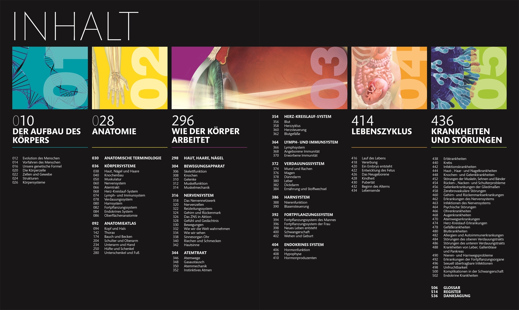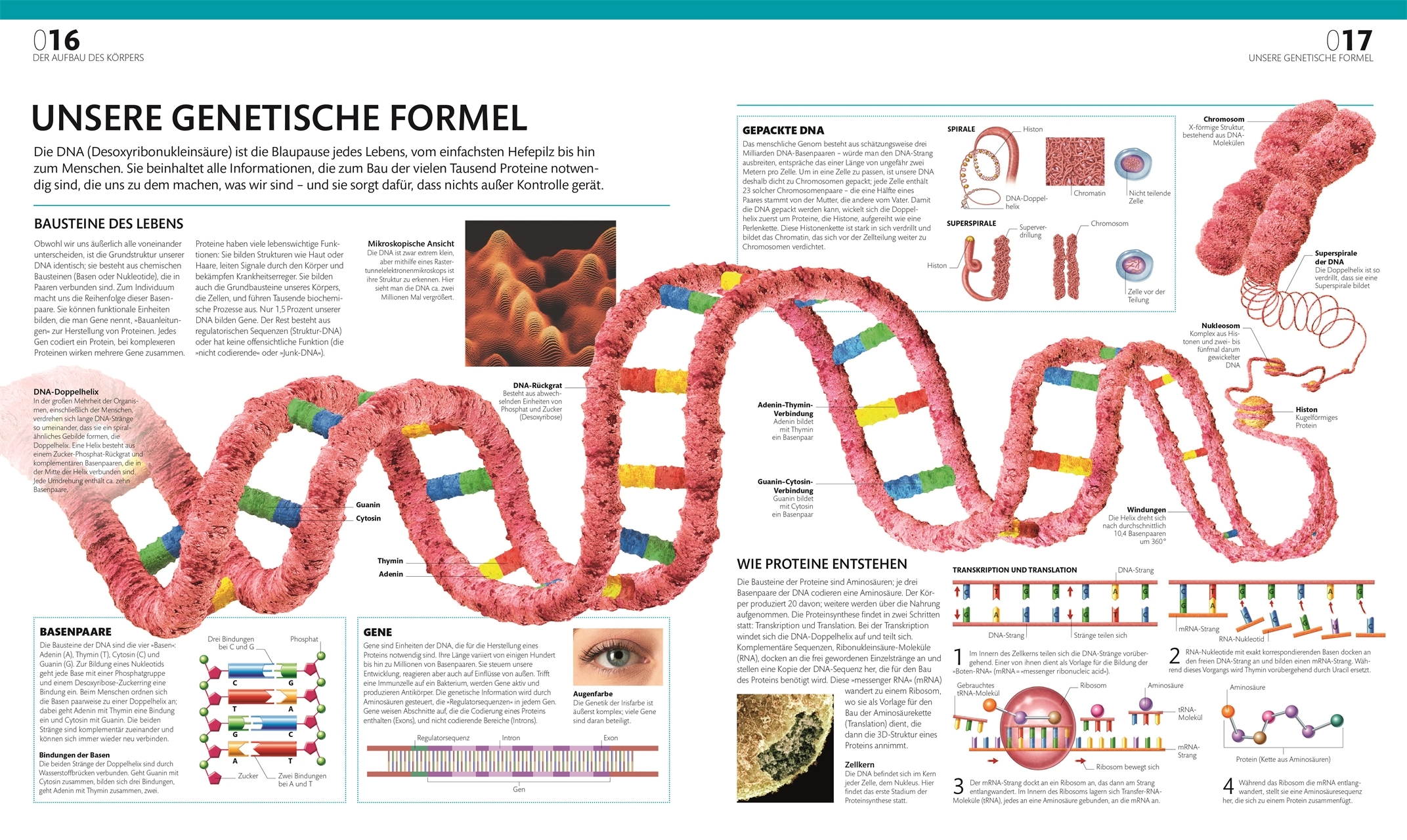 Wie groß ist das Herz? Wie funktioniert das Nervensystem? Und wie wird aus einem Embryo ein ausgewachsener Mensch? Die illustrierte Enzyklopädie beantwortet ausführlich alle Fragen zur Physiologie und Anatomie des Menschen. In fünf umfangreichen Kapiteln führt es die Leserinnen durch sämtliche Körperregionen, zeigt anschaulich, *wie der Körper funktioniert, welche Entwicklungsstadien wir in unserem Leben durchlaufen und wie die Evolution unsere Entwicklung beeinflusst hat. Von der Fortpflanzung über Haut, Haare und Nägel bis zum komplexen Verdauungssystem: Spektakuläre, teilweise maßstabsgetreue Abbildungen** machen dieses Anatomiebuch zum ultimativen Nachschlagewerk für alle, die sich für Medizin, Biologie und den menschlichen Körper interessieren.