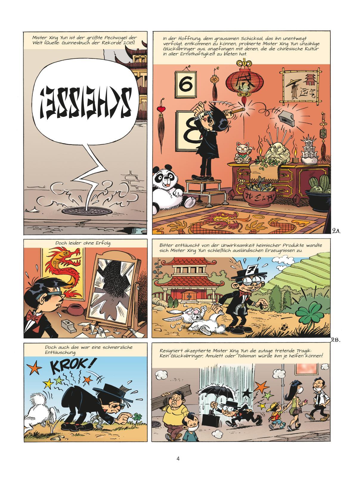 Mister Xing Yun hat ein hartes Schicksal, er ist der unglücklichste Mann der Welt! Nachdem er unzählige Talismane, Amulette und andere Zauber erprobt und alle Hoffnung aufgegeben hat, erfährt er ein Geheimnis: Die schwarzen Haare eines Marsupilamis sollen Glück bringen. Und so bricht Mister Xing Yun nach Palumbien auf, um einige dieser kostbaren Haare zu finden. Ob er wohl genug Glück hat, um im Dschungel ein Marsupilami aufzutreiben?