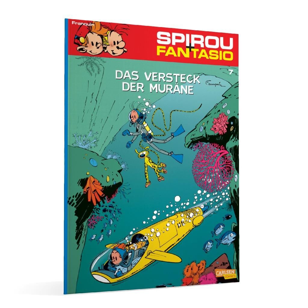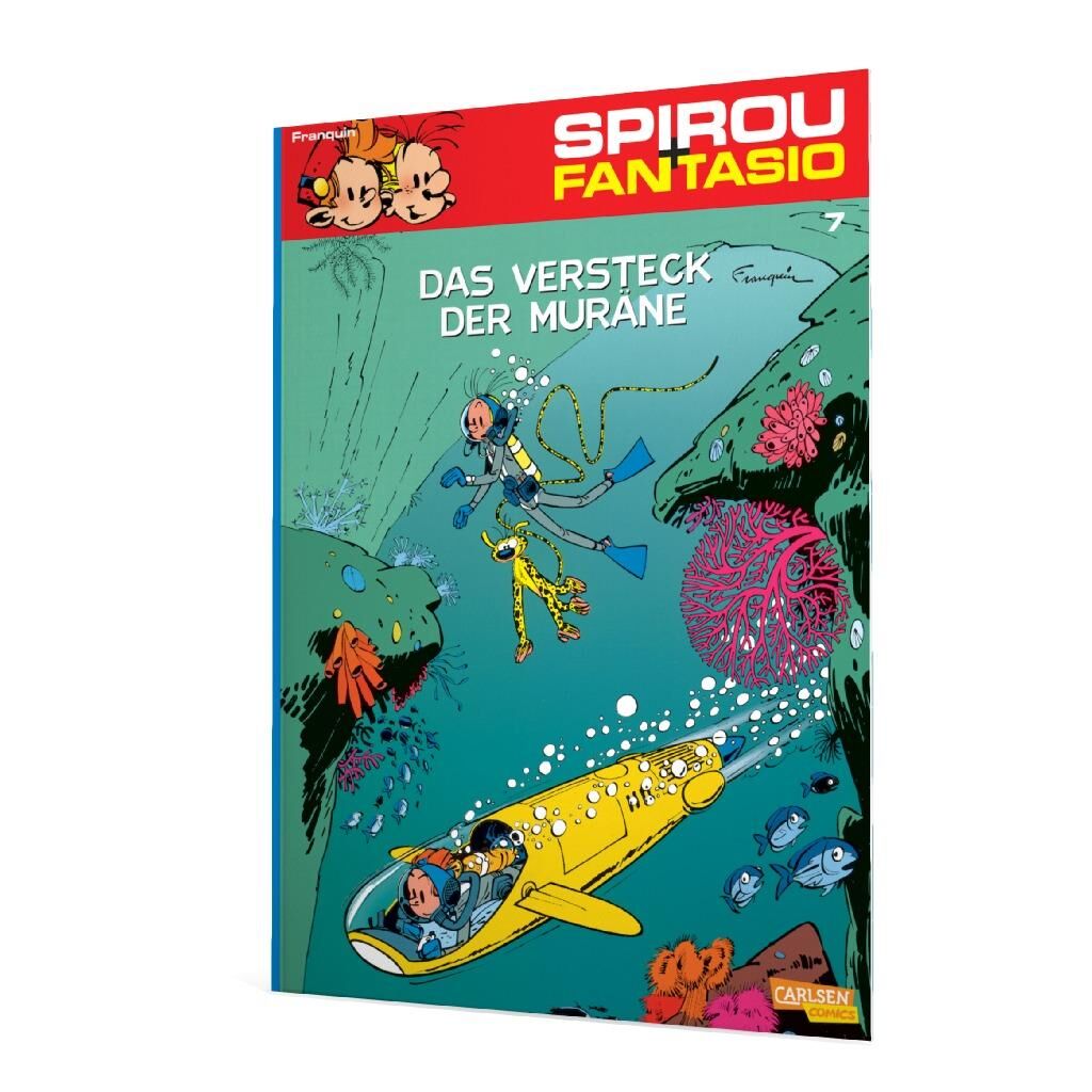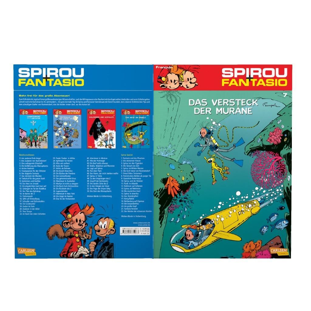 Gemeinsam mit dem Grafen von Rummelsdorf nehmen Spirou und Fantasio an einem Wettbewerb zum Bau einer Unterwasserausrüstung teil. Sehr bald müssen sie jedoch feststellen, dass es dabei nicht gerade mit rechten Dingen zugeht. Auf dem Meeresgrund stößt Spirou sc...Gemeinsam mit dem Grafen von Rummelsdorf nehmen Spirou und Fantasio an einem Wettbewerb zum Bau einer Unterwasserausrüstung teil. Sehr bald müssen sie jedoch feststellen, dass es dabei nicht gerade mit rechten Dingen zugeht. Auf dem Meeresgrund stößt Spirou schließlich in einem Wrack auf das Versteck des Gangsters John Helena - genannt "die Muräne". Wie alle Bände der neuen "Spirou und Fantasio"-Edition erscheint auch "Das Versteck der Muräne" in verbesserter Ausstattung: Einfühlsame Neukolorierung, bessere Papier- und Druckqualität, redaktionelle Zusatzseiten mit Hintergrundinformationen zum Album und raren Illustrationen.
