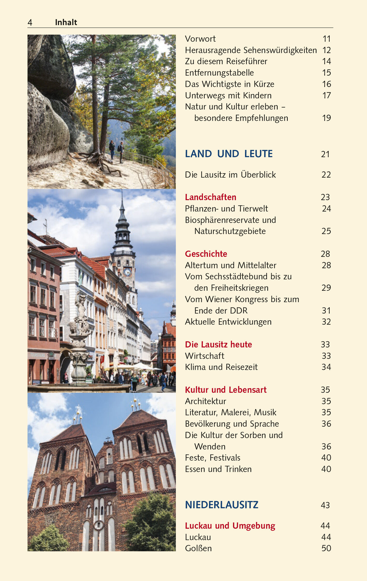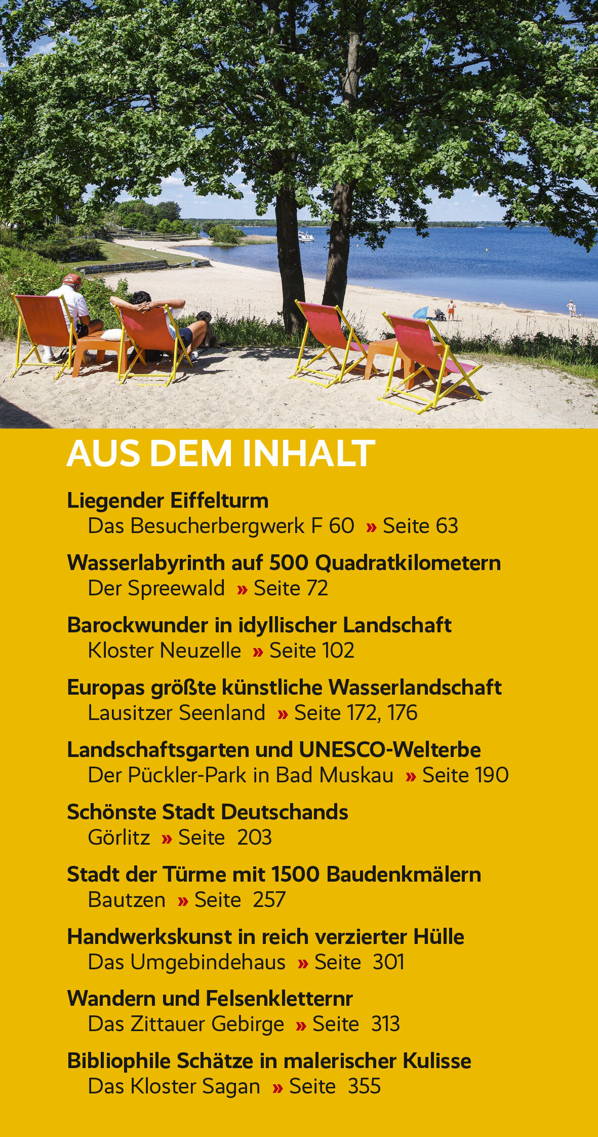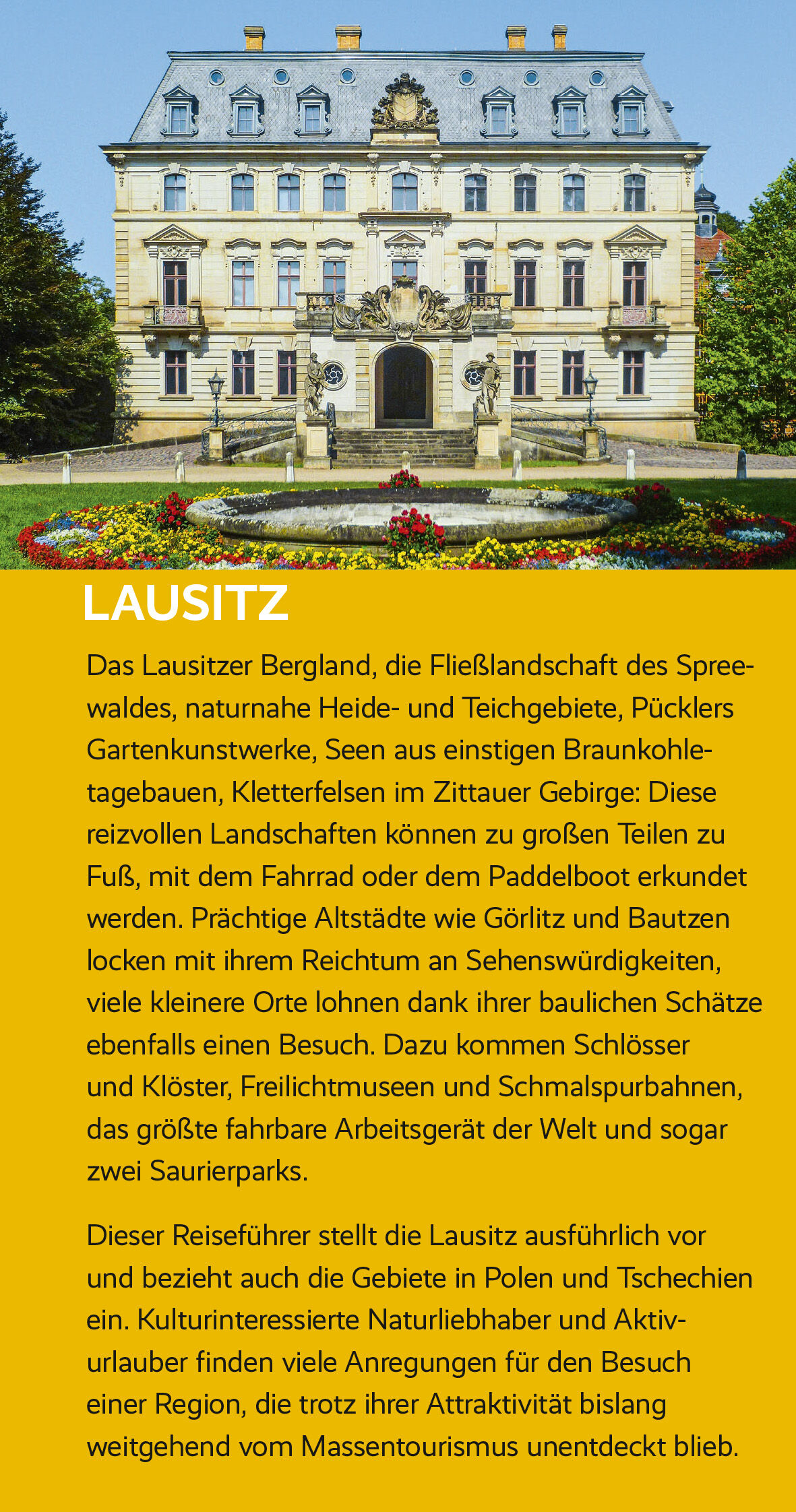 Die Lausitz ist eine sehr vielfältige Landschaft zwischen Spreewald und Zittauer Gebirge im Osten Deutschlands. Sie ist die Heimat der Sorben und Wenden, des kleinsten slawischen Volkes, deren Volkskunst und Brauchtum noch vielerorts gepflegt werden."Für die Deutschen ist das eigene Land der letzte unentdeckte Kontinent", sagt der Kulturkritiker Gottfried Knapp. Diese These trifft für die Lausitz im besonderen Maße zu: Naturschönheiten und Baudenkmäler finden sich in großer Anzahl, sind aber zumeist überregional nur wenig bekannt. So rühmt sich die Oberlausitz mit Görlitz als der schönsten Stadt Deutschlands. In der Niederlausitz, in Burg/Spreewald, schwärmen die Besucher von einem der besten Wellnesshotels samt fantasievoller Gourmetküche. Lohnende Urlaubs- oder Ausflugsziele finden sich in großer Auswahl: herrliche Wälder im Lausitzer Bergland, die Fließlandschaft des Spreewaldes, naturnahe Heide- und Teichgebiete, Pücklers Gartenkunstwerke - in Bad Muskau als UNESCO-Weltkulturerbe geadelt -, Seen aus einstigen Braunkohletagebauen, Kletterfelsen im Zittauer Gebirge, Schlösser, Kirchen, Freilichtmuseen, Schmalspurbahnen, das größte fahrbare Arbeitsgerät der Welt und sogar zwei Saurierzoos. Prächtige Altstädte, wie neben Görlitz das tausendjährige Bautzen, lohnen ebenso einen Besuch wie jene von Cottbus und Zittau. Auch viele kleine Städte und Dörfer sowie Klöster und Schlösser haben bemerkenswerte Sehenswürdigkeiten aufzuweisen.Diese Orte sind in reizvolle Landschaften gebettet, die zu großen Teilen zu Fuß, mit dem Fahrrad oder mit dem Paddelboot erkundet werden können. Die Besucher erwarten abwechslungsreiche Wander- und Radwege weitab von Lärm und der Hektik des Alltags, darunter Teilstücke des Spreeradweges und des Oder-Neiße-Radweges, die inzwischen zu den beliebtesten in Deutschland zählen.Mit Ausnahme des Spreewalds ist die Lausitz kein Ziel des Massentourismus. Angesichts der Fülle an baulichen Schätzen und Naturschönheiten eignet sich die Region aber zweifellos ebenso für Tages- und Wochenendausflüge und für Kurzurlaube wie für längere Aufenthalte.