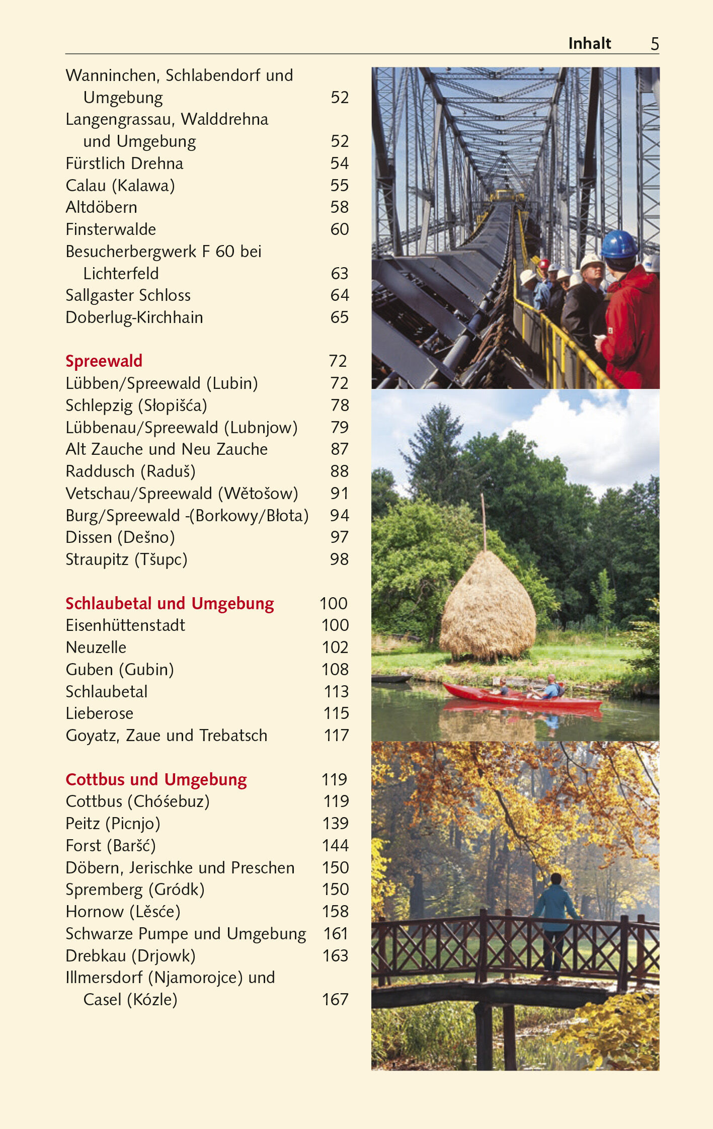 Vorwort 11 Herausragende Sehenswürdigkeiten 12 Zu diesem Reiseführer 14 Entfernungstabelle 15 Das Wichtigste in Kürze 16 Unterwegs mit Kindern 17 Natur und Kultur erleben besondere Empfehlungen 19 LAND UND LEUTE 21 Die Lausitz im Überblick 22 Landschaften 23 Pflanzen- und Tierwelt 24 Biosphärenreservate und Naturschutzgebiete 25 Geschichte 28 Altertum und Mittelalter 28 Vom Sechsstädtebund bis zu den Freiheitskriegen 29 Vom Wiener Kongress bis zum Ende der DDR 31 Aktuelle Entwicklungen 32 Die Lausitz heute 33 Wirtschaft 33 Klima und Reisezeit 34 Kultur und Lebensart 35 Architektur 35 Literatur, Malerei, Musik 35 Bevölkerung und Sprache 36 Die Kultur der Sorben und Wenden 36 Feste, Festivals 40 Essen und Trinken 40 NIEDERLAUSITZ 43 Luckau und Umgebung 44 Luckau 44 Golßen 50 Wanninchen, Schlabendorf und Umgebung 52 Langengrassau, Walddrehna und Umgebung 52 Fürstlich Drehna 54 Calau (Kalawa) 55 Altdöbern 58 Finsterwalde 60 Besucherbergwerk F 60 bei Lichterfeld 63 Sallgaster Schloss 64 Doberlug-Kirchhain 65 Spreewald 72 Lübben/Spreewald (Lubin) 72 Schlepzig (Sopia) 78 Lübbenau/Spreewald (Lubnjow) 79 Alt Zauche und Neu Zauche 87 Raddusch (Radu) 88 Vetschau/Spreewald (Wtoow) 91 Burg/Spreewald -(Borkowy/Bota) 94 Dissen (Deno) 97 Straupitz (Tupc) 98 Schlaubetal und Umgebung 100 Eisenhüttenstadt 100 Neuzelle 102 Guben (Gubin) 108 Schlaubetal 113 Lieberose 115 Goyatz, Zaue und Trebatsch 117 Cottbus und Umgebung 119 Cottbus (Chóebuz) 119 Peitz (Picnjo) 139 Forst (Bar) 144 Döbern, Jerischke und Preschen 150 Spremberg (Gródk) 150 Hornow (Lse) 158 Schwarze Pumpe und Umgebung 161 Drebkau (Drjowk) 163 Illmersdorf (Njamorojce) und Casel (Kózle) 167 Senftenberg und Umgebung 169 Senftenberg (Zy Komorow) 169 Großräschen 176 Lauchhammer 179 OBERLAUSITZ 183 Muskauer Heide 184 Weißwasser (Ba Woda) 184 Krauschwitz (Kruwica) 187 Bad Muskau (Muakow) 189 Muskauer Park 190 Kromlau 196 Schleife (Slepo) 197 Boxberg (Hamor) 198 Rietschen und Umgebung 200 Görlitz und Umgebung 203 Görlitz 203 Ostritz/St. Marienthal 221 Reichenbach 223 Königshain und Königshainer Berge 224 Rothenburg/O.L. 226 Niesky (Nieska) 229 Hoyerswerda und Umgebung 232 Hoyerswerda (Wojerecy) 232 Schwarzkollm (orny Cholmc) 236 Wittichenau (Kulow) 236 Uhyst (Delni Wujzd), Lohsa (az) und Knappenrode (Hórnikecy) 239 Kamenz und Umgebung 241 Kamenz (Kamjenc) 241 Nebelschütz, Miltitz und Dürrwicknitz 246 Königsbrück 247 Oberlichtenau 248 Pulsnitz 250 Elstra 253 Panschwitz-Kuckau (Panicy-Kukow) 253 Räckelwitz (Worklecy) und Crostwitz (Chrósicy) 255 Bautzen und…