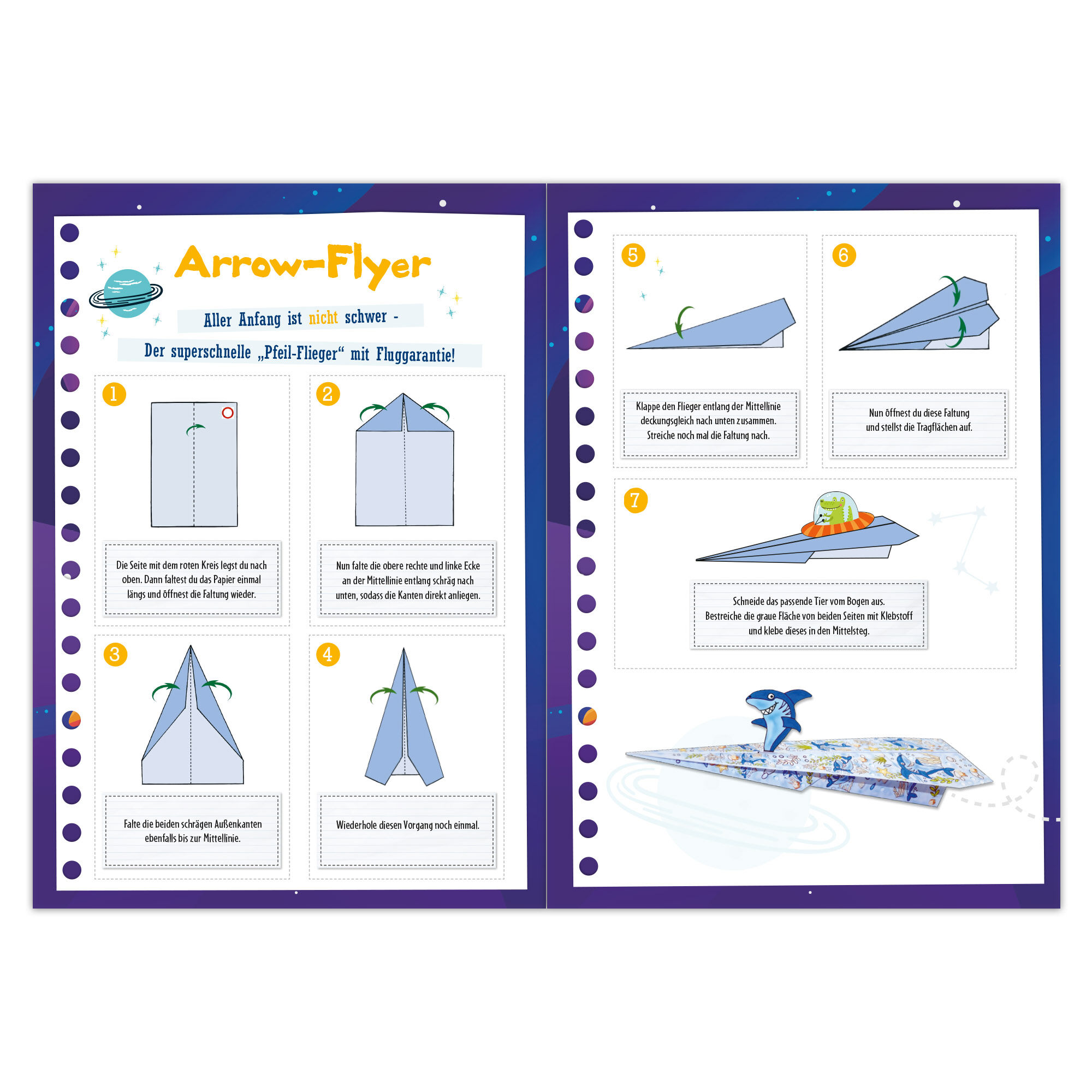 Fliegender Faltspaß Begebe dich auf eine abenteuerliche Reise durch die Lüfte mit den rasend schnellen und ultracoolen Papierfliegern, perfekt für Dinosaurier-, Weltraum- und Fahrzeug-Fans! Die bunt bedruckten Bastelbögen lassen sich einfach ausschneiden, nac...
