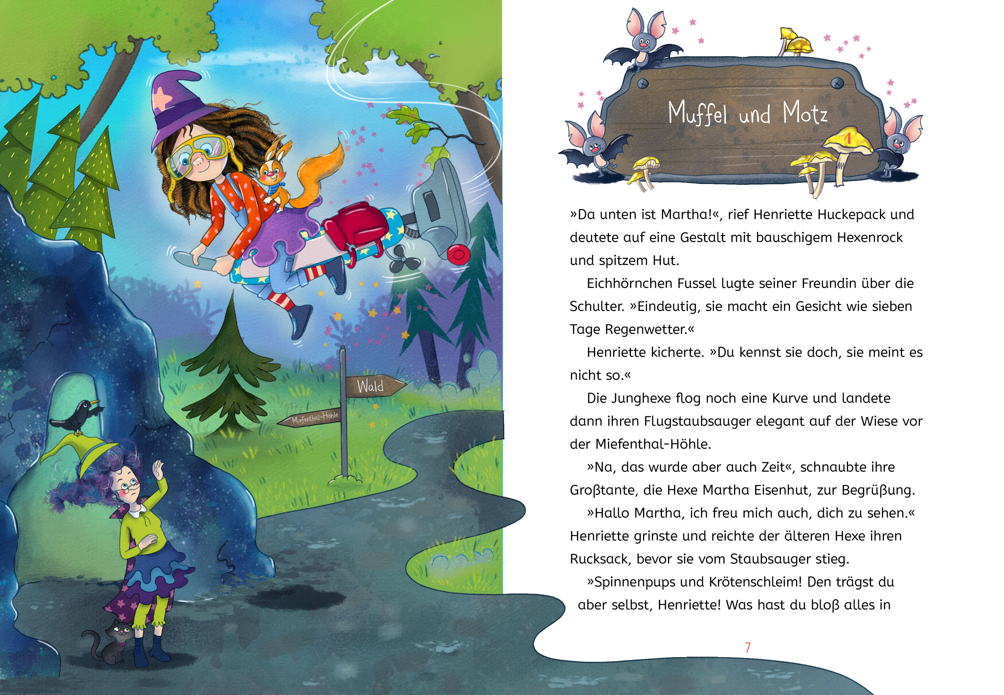 Henriette Huckepack und Großtante Martha brechen zu einer Expedition in die dunkle Miefenthal-Höhle auf. Hier wächst der Fungus Muffelkuss, ein magischer Pilz, den die alte Hexe dringend für ihre Zaubertränke benötigt. Doch als Martha mit dem Kopf vor eine Felswand läuft, weiß sie nicht mehr, wer sie ist und kein einziger Hexspruch fällt ihr ein! Spinnenpups und Krötenschleim wie sollen die beiden jetzt bloß wieder aus der Höhle herausfinden?! Henriette muss versuchen zu hexen, obwohl sie die Zaubersprüche doch immer durcheinanderbringt ob das gut geht?