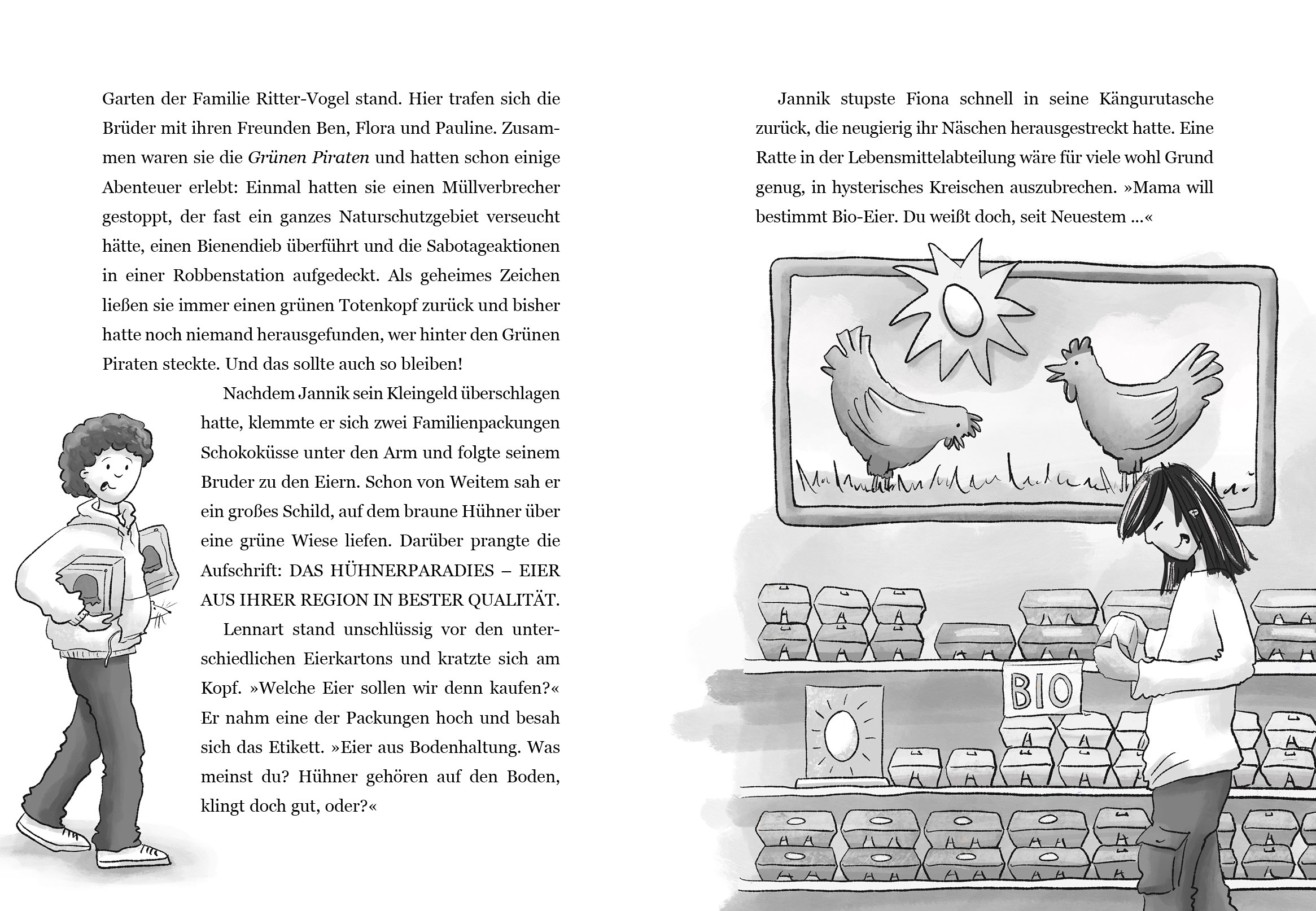 Zufällig geraten Ben und Flora in den Stall des Hühnerhofs "Hühnerparadies". Hunderte von Hühnern drängen sich hier auf engstem Raum. Die Grünen Piraten sind entsetzt und bauen ein Protestmobil, um vor dem Supermarkt gegen die beengte Hühnerhaltung zu demonstrieren. Doch dann wird das Protestmobil gestohlen und sämtliche Bioeier verschwinden aus den Regalen des Supermarkts. Was geht hier vor? Die Grünen Piraten nehmen die Spur auf ...