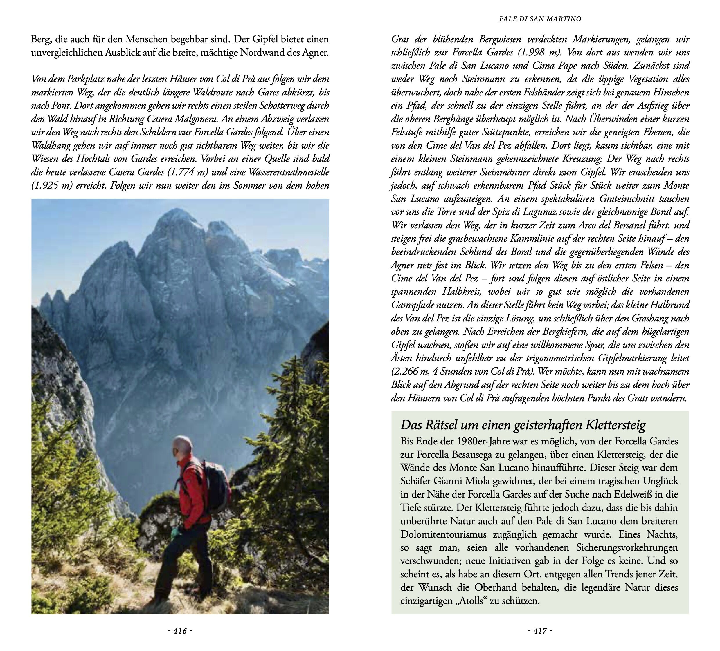 Seen umgeben von grünen Hochgebirgsweiden, zwischen Felswänden verborgene Labyrinthe, alte Bergbaudörfer und verlassene Weiler , ein Gefängnis für osmanische Kriegsgefangene, ein Gletscherrandsee, ein Felsen, der sich allen Gesetzen der Schwerkraft widersetzt, zu Stein gewordene Bischöfe, Zwerge, Gnome und ein Elefant mit Augen, Ohren und Rüssel, geheimnisvolle Höhlen, Schluchten und Portale , schwindelerregende Ausblicke an den höchsten Steilwänden der Dolomiten, ein unberührter Zauberwald, verlassene Schutzhütten auf verborgenen Hochebenen, einsame Einsiedeleien, steinerne Bücher in einer Freiluftbibliothek, die Pfade mesolithischer Jäger, ein zwischen blutroten Wänden eingeklemmter Gletscher und ein anderer mit bezaubernden türkisblauen Augen, verwaiste Klettersteige, unbekannte und namenlose Gipfel, eine Wanderung auf dem Pfad der Luftgeister.