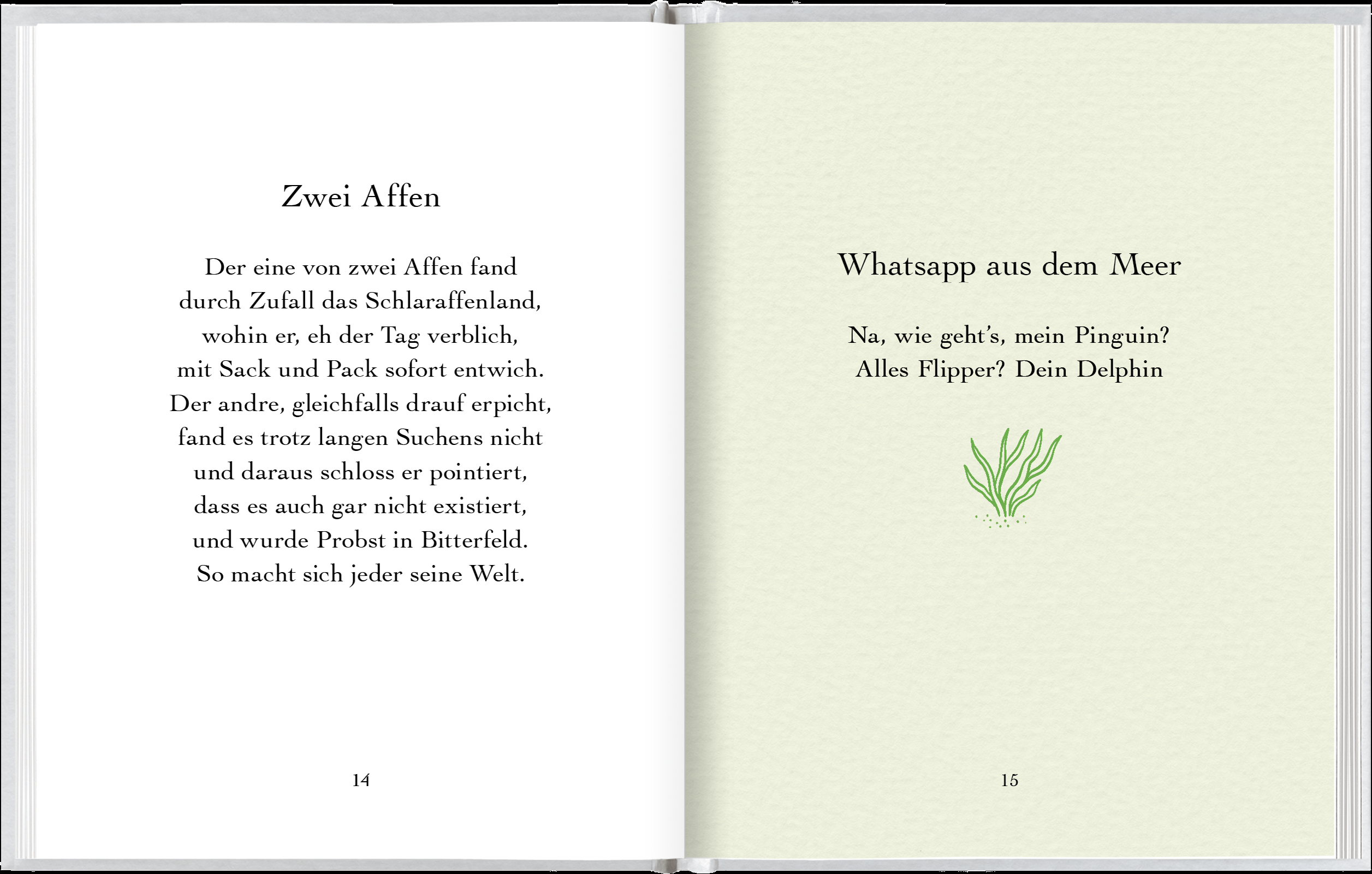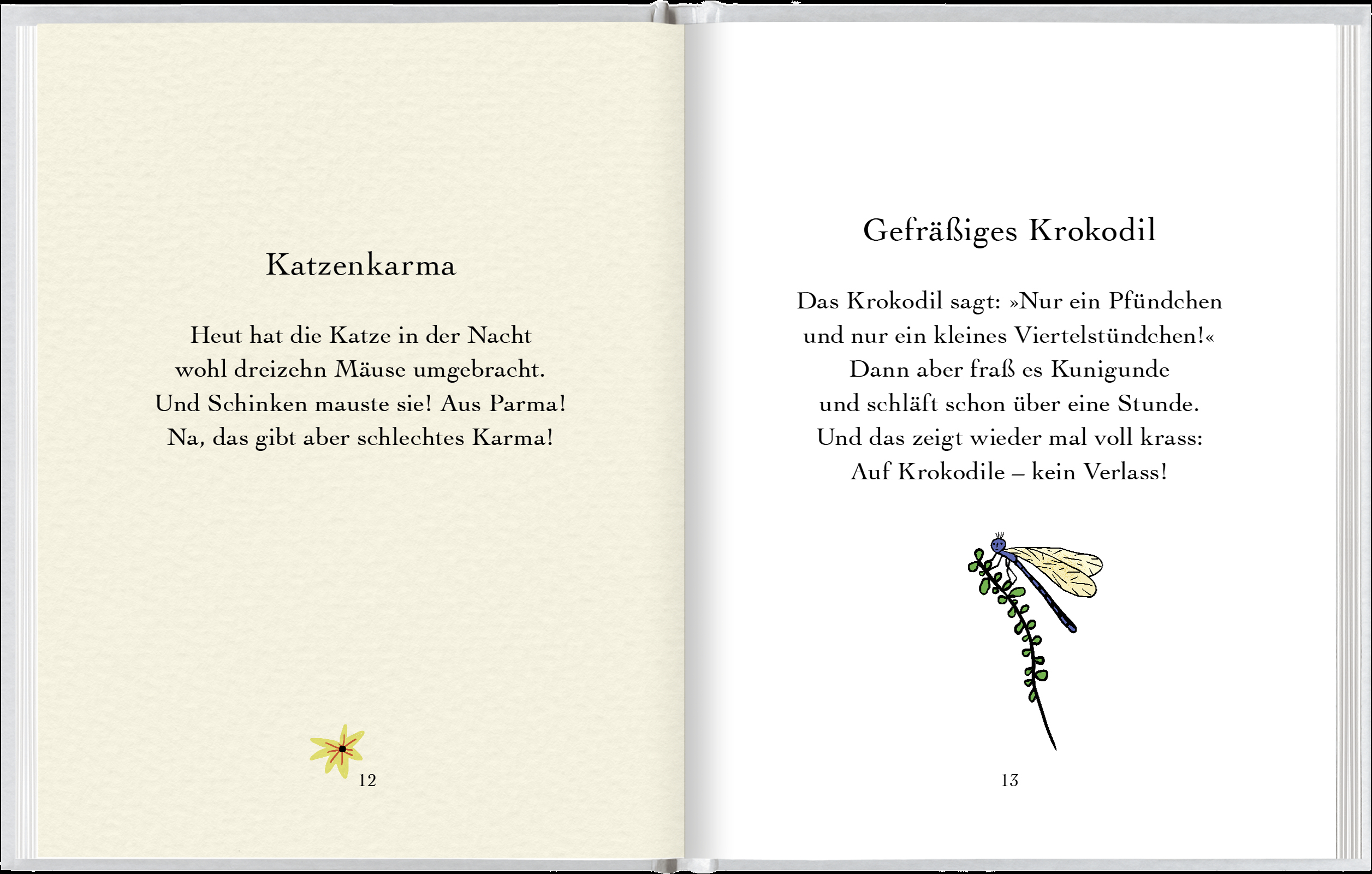 Lustige Tiergedichte voller skurrilem Humor In diesen lustigen Gedichten über Affen auf der Suche nach dem Schlaraffenland, über modeaffine Kragenbären und andere tierische Zeitgenossen zeigt sich: Tiere sind auch nur Menschen! Mit skurrilem Humor halten uns ...