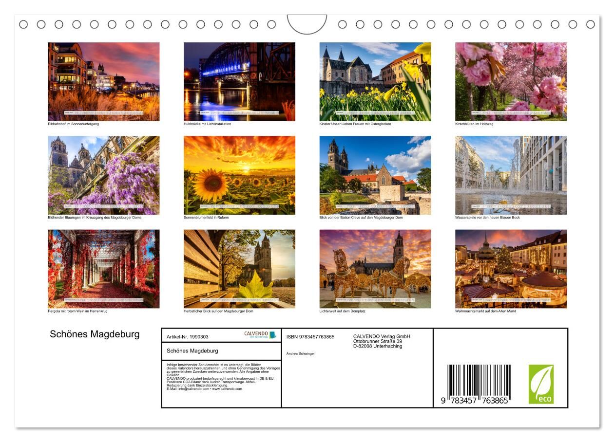 Ein Kalender der mit 12 verschiedenen, farbenfrohen Magdeburg-Motiven, von Magdeburgs Sehenswürdigkeiten wie dem Magdeburger Dom, dem Herrenkrug und der Elbuferpromenade bis hin zu stimmungsvollen und jahreszeitlich geprägten Momentaufnahmen wie dem gemütliche...