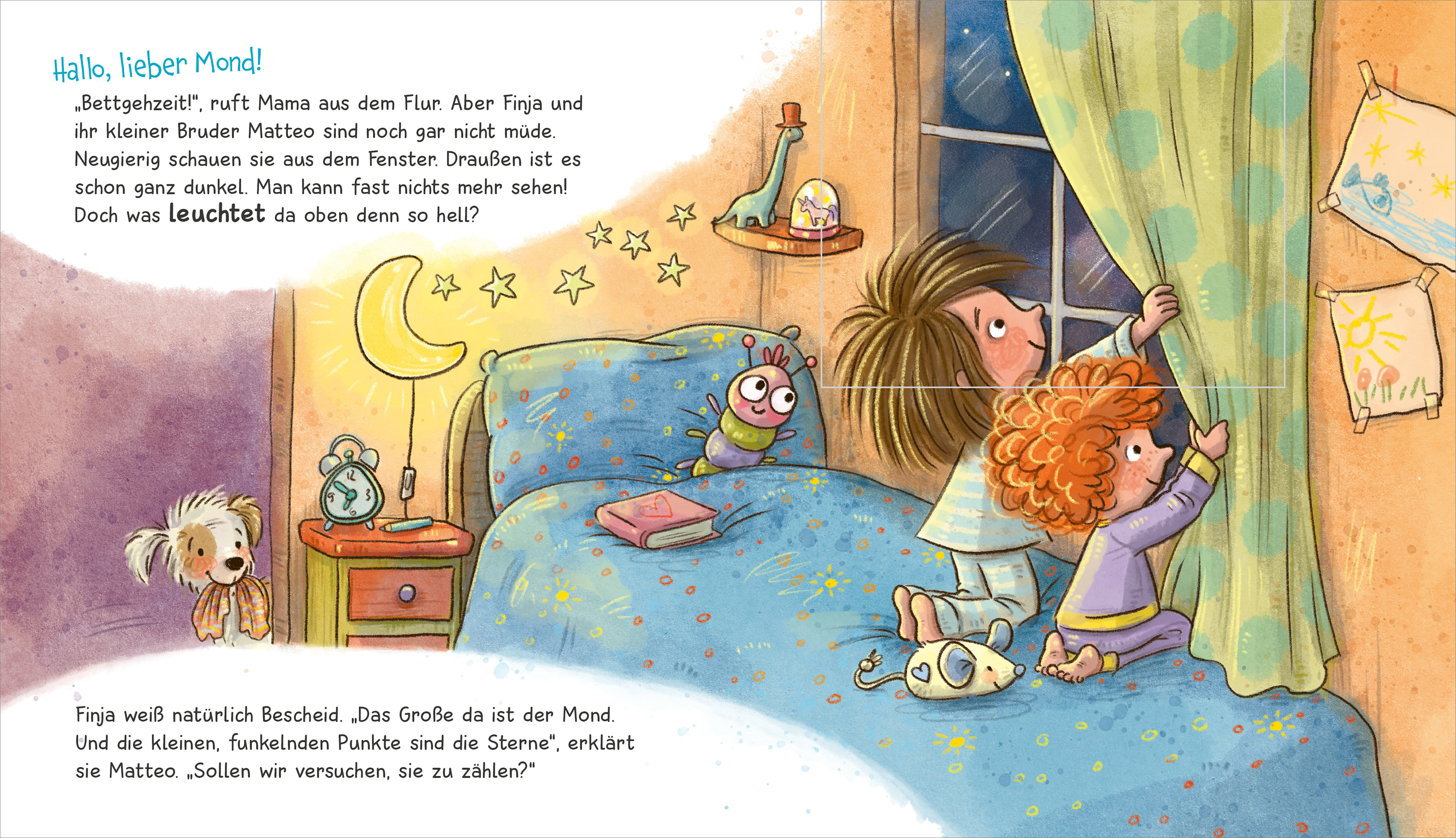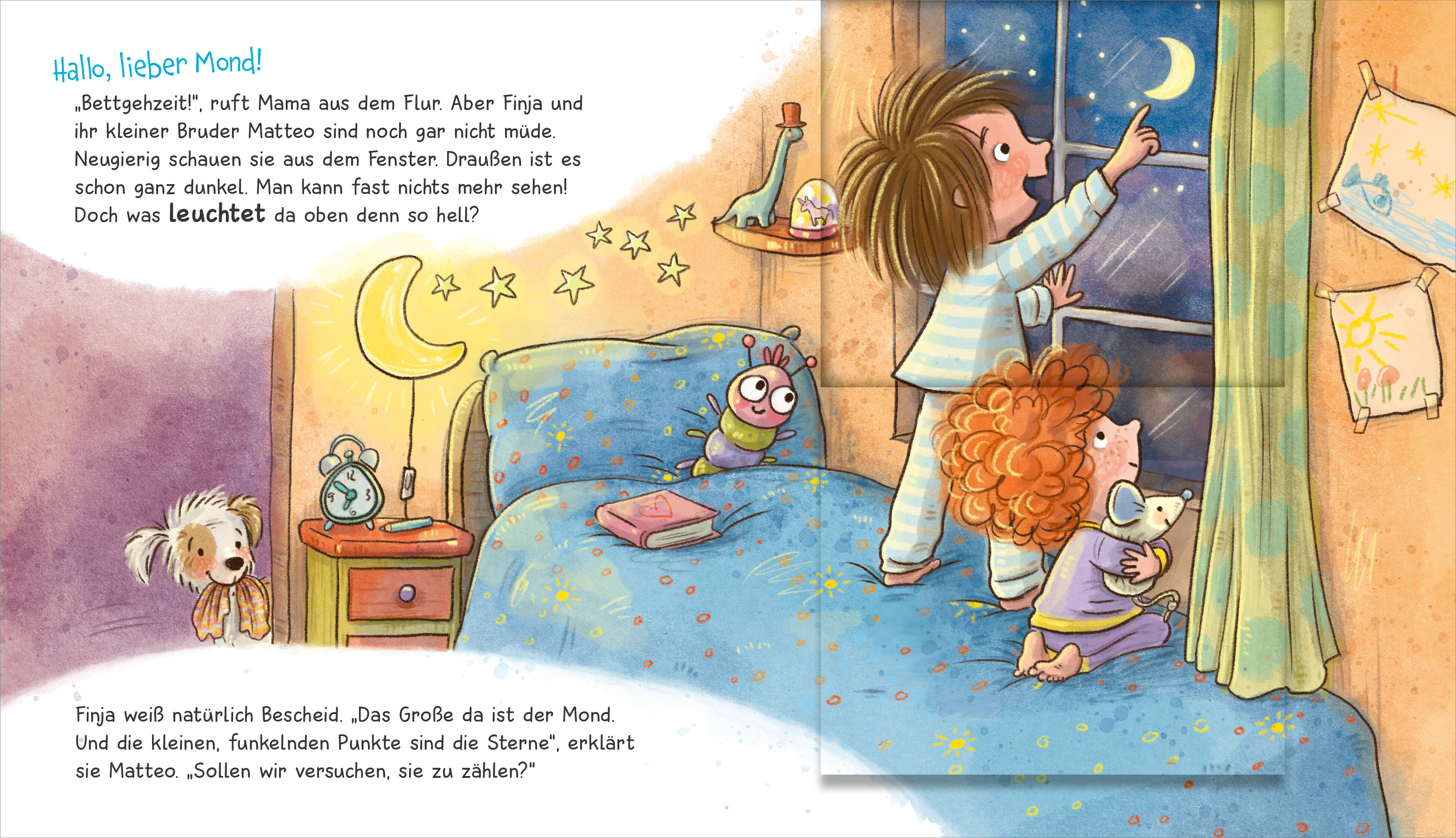 Der Himmel fasziniert: Nachts funkeln dort die Sterne und der Mond scheint in das Kinderzimmer. Tagsüber steht die Sonne am Himmel. Sie macht den Tag hell und warm. Warum wird es dunkel? Und wieso sieht der Mond unterschiedlich aus? Finja und ihr kleiner Brude...