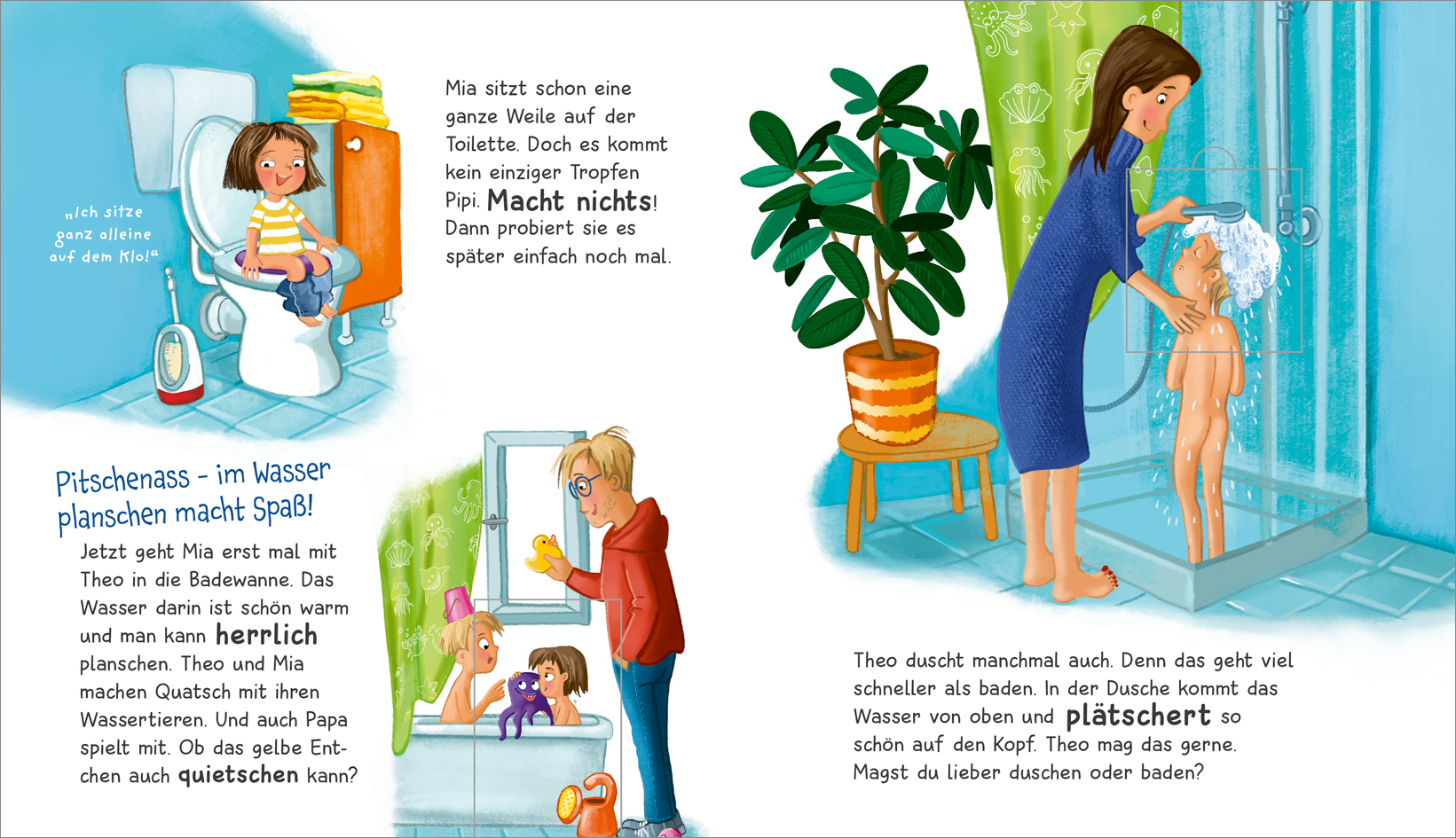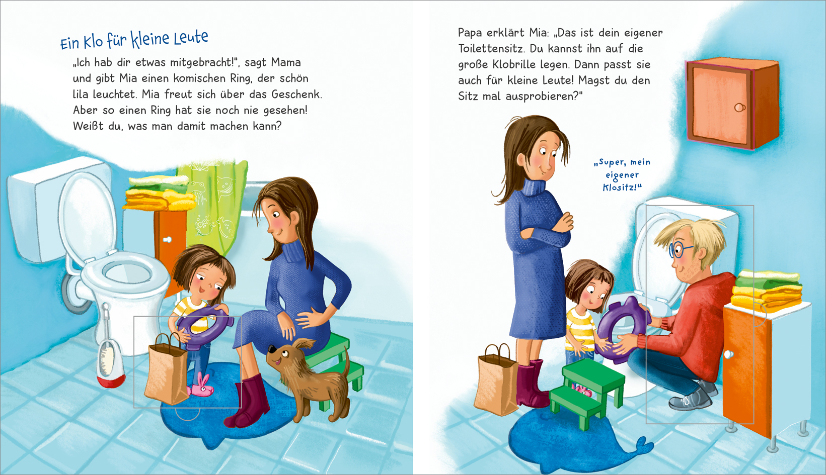 Mia beobachtet ihren großen Bruder Theo auf dem Klo: Das will sie auch, ihre Windel soll weg! Von Mama bekommt sie einen bunten Toilettenaufsatz. Am Anfang klappt es noch nicht, das macht aber nichts. Dann macht Mia Pipi ins Klo! Und später landet dort auch da...