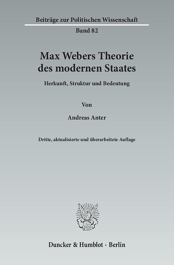 »Max Weber´s Theory of a Modern State. Origin, Structure, Importance« This highly regarded study provides a comprehensive presentation and interpretation of Weber's theory of state. It reconstructs the fragments scattered throughout the work, points to the origin of the individual concepts and their significance for contemporary state theory. Andreas Anter demonstrates how closely Weber follows contemporary thinkers especially Georg Jellinek and Friedrich Nietzsche and sharpened and modified their concepts. At the same time, Max Weber's ambivalence becomes clear: the wavering between an etatist attitude oriented towards state reason and an individualistic position that inquires about the freedom of the individual.