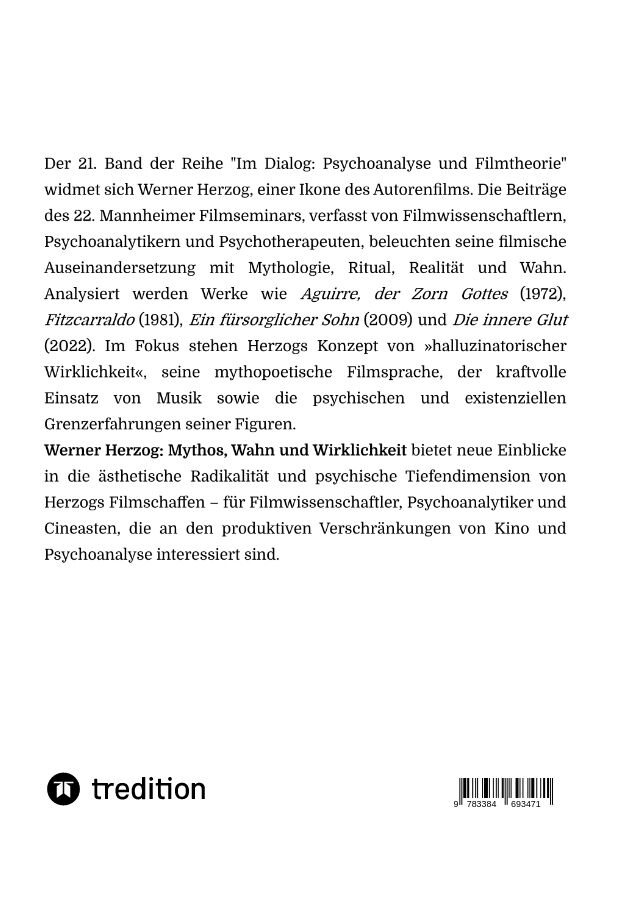 Der 21. Band der Reihe "Im Dialog: Psychoanalyse und Filmtheorie" widmet sich Werner Herzog, einer Ikone des Autorenfilms. Die Beiträge des 22. Mannheimer Filmseminars, verfasst von Filmwissenschaftler:innen, Psychoanalytiker:innen und Psychotherapeut:innen, b...