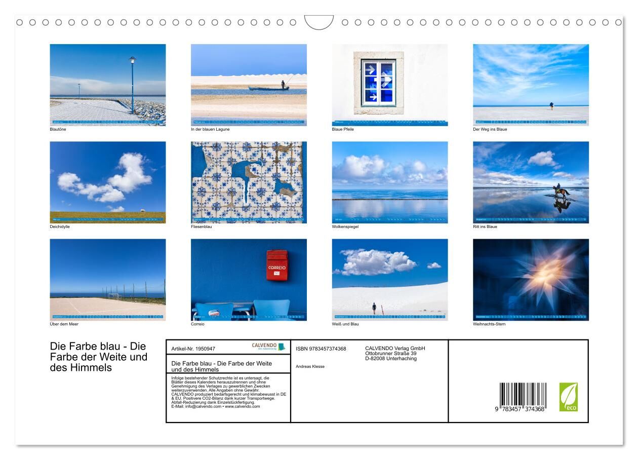 Die beruhigende und entspannende Wirkung der Farbe Blau baut Stress ab und schafft eine positive und entspannte Atmosphäre. Ein Kalender, der diese Eigenschaften durch blaue Bilder betont, bietet nicht nur ästhetischen Genuss, sondern trägt auch zu einem besse...