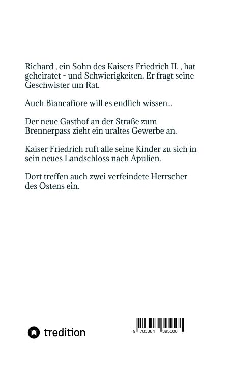 Die Familiengeschichte der Kinder des genialen Kaisers Friedrich II. wird weitererzählt. Eine Tochter ist dem oströmischen Kaiser versprochen, nur welche? Der gut anlaufende neue Gasthof bringt uralte Probleme mit sich, die nach ganz anderen Lösungen verlangen...
