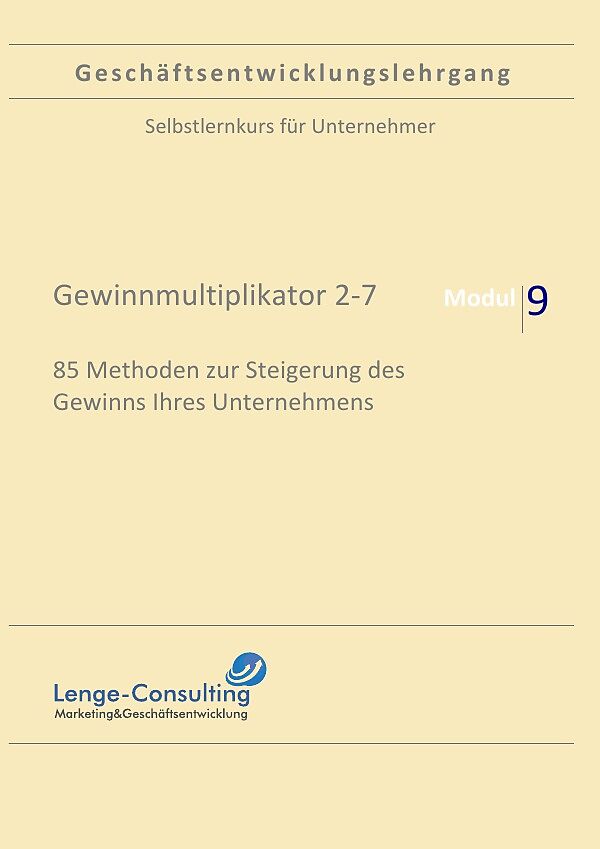 Dieser Selbstlernkurs beinhaltet 9 Module und ist ein Programm, um Ihr Unternehmen aufzubauen und weiterzuentwickeln. In Modul 9 zeigen wir Ihnen 85 Methoden, um Ihren Gewinn weiter zu erhöhen. Dieser Selbstlernkurs beinhaltet 9 Module und ist ein einzigartige...