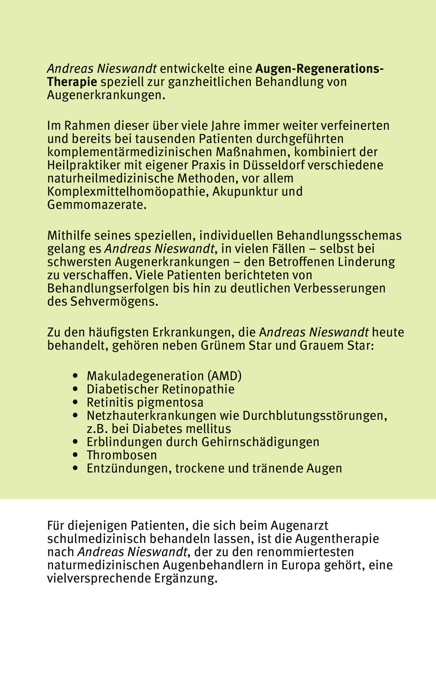Mit mehr als 6.000 Leserinnen und Leser gehört dieses Buch mittlerweile zu den Bestsellern der alternativen Augenheilkunde. Gerade für Patienten, die sich beim Augenarzt schulmedizinisch behandeln lassen, ist die Augentherapie nach Andreas Nieswandt, der zu de...