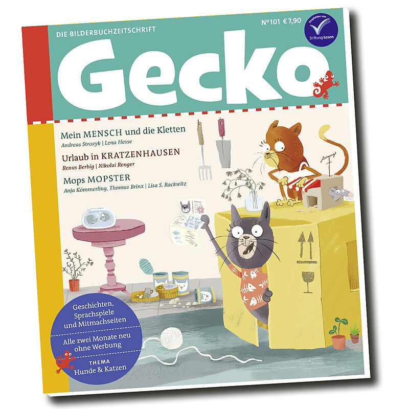 Katzen und Hunde die beliebtesten Haustiere haben ihren Auftritt in Gecko Nr. 101. Los geht's mit einer wahren Begebenheit, erzählt aus Hundesicht, nämlich der Erfindung des Klettverschlusses. Andreas Strozyk gibt den Memoiren des Hundes eine Stimme, und Illus...Katzen und Hunde die beliebtesten Haustiere haben ihren Auftritt in Gecko Nr. 101. Los geht's mit einer wahren Begebenheit, erzählt aus Hundesicht, nämlich der Erfindung des Klettverschlusses. Andreas Strozyk gibt den Memoiren des Hundes eine Stimme, und Illustratorin Lena Hesse ein Gesicht, dem man einfach nicht böse sein kann. Was Katzen gerne im Urlaub tun wurden, weiß niemand besser Renus Berbig. Er hat den wohl katzenfreundlichsten Urlaub in Kratzenhausen erdacht und Nikolai Renger den ultimativen Reiseprospekt dazu illustriert. »Wie Hund und Katz« sind Mops Mopster und Katze Lotte am Gartenzaun sie können sich einfach nicht ausstehen. Anja Kömmerling, Thomas Brinx und Lisa Rackwitz erkunden in »Mops Mopster« Konfliktbewältigung bei Nachbars-Tieren und Kindern. Bei »Sachen machen« gibt es diesmal ein Backrezept für täuschend echte »Hundehäufchen« - zum Leute-Erschrecken und hinterher Verspeisen. Das ABC der Tunwörter von Ina Hattenhauer zeigt diesmal schöne Wendungen mit »sch« wie »schlafen«. Und das Geckodicht ist eine richtige Kopfnuss fur Klein und Groß. Viel Spaß beim Vorlesen und ersten Selberlesen! 52 bunte Seiten zum Vor- und Selberlesen für neugierige Kinder ab 4 und ihre Erwachsenen. Gecko 101 erscheint am 2. Mai 2024 ISBN 978-3-911209-00-7 Die Geschichten: »Mein Mensch und die Kletten« von Andreas Strozyk und Lena Hesse »Urlaub in Kratzenhausen« von Renus Berbig und Nikolai Renger »Mops Mopster« von Anja Kömmerling, Thomas Brinx und Lisa S. Rackwitz Alle Künstlerinnen und Künstler dieser Gecko-Ausgabe: Andreas Strozyk, Lena Hesse, Renus Berbig, Nikolai Renger, Stefanie Duckstein, Anja Kömmerling, Thomas Brinx, Lisa S. Rackwitz, Katja Enseling, Katrin Wiegand, Mascha Greune, Bettina Bexte, Ina Hattenhauer, Uwe-Michael Gutzschhahn, Franziska Ludwig, Ina Nefzer. - - - - - - - - - - - - - - - - - - - - - - - - - - - - - - - - - - - - - - - - - - - - - - - - - - - - Gecko ist eine werbefreie Bilderbuch-Zeitschrift für neugierige Kindergartenkinder ab 4 Jahren und Grundschulkinder. Jede Ausgabe ist voll mit neuen spannenden Geschichten zum Vorlesen und Selberlesen und eigens für Gecko illustriert! Außerdem gibt es Wortspiele, Mitmachseiten, Buchtipps, Rätsel, Bastelideen, Gedichte, ein Experiment und vieles mehr. Alle Geschichten haben die ideale Länge für Gutenachtgeschichten. Gecko wurde mit dem Qualitätssiegel der Stiftung Lesen ausgezeichnet. Gecko gibt es auch als Abonnement: Alle Eltern, Großeltern, Tanten und Onkel können ihren Kindern ein Jahr Vorlesespaß und gemeinsame Zeit schenken. Alle zwei Monate freuen sich die kleinen Abonnenten auf eigene Post. Auf www.gecko-kinderzeitschrift.de und in jeder Buchhandlung.