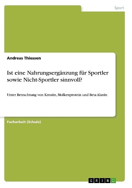 Facharbeit (Schule) aus dem Jahr 2017 im Fachbereich Sport - Sportmedizin, Therapie, Prävention, Ernährung, Note: 2,0, , Sprache: Deutsch, Abstract: Die Facharbeit wurde im Sport-Leistungskurs verfasst und behandelt den Nutzen von Nahrungsergänzungsmitteln wie...