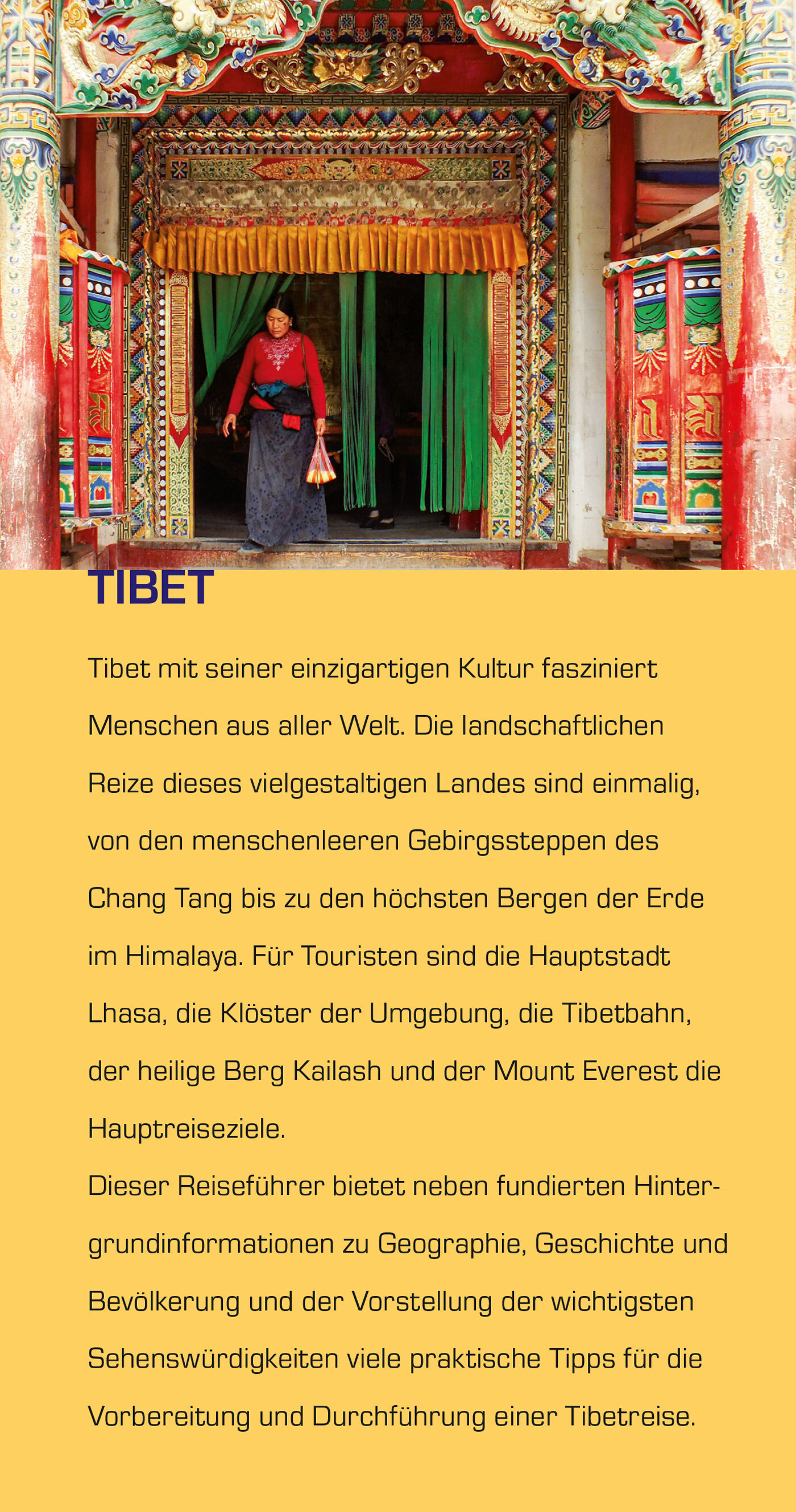 VORWORT DER TIBET INITIATIVE DEUTSCHLANDZuerst einmal vorweg, Tibet war und ist ein fantastisches Land, mit einer einzigartigen Landschaft, mit einer faszinierenden tibetischen Kultur und wunderbaren Menschen. Ein Land, das ein Muss für Reisende sein sollte, die mehr wollen als Meer, Sonne und gutes Essen.Tibet ist und bleibt ein Erlebnis, wenn man sich als Reisender voll und ganz auf dieses Land einlässt. Waren es früher gewagte Verkehrswege und eine einfache touristische Infrastruktur, die man überwinden musste, so hat sich dies nun in das Gegenteil verkehrt. Autobahnsysteme, Eisenbahnwege und ein gigantischer Bauboom, besonders in Lhasa, prägen das Erscheinungsbild.Das Abenteuer der heutigen Zeit besteht darin, durch all diese Modernisierungen, Baukörper im pseudotibetischen Stil sowie das erstarkte chinesische Erscheinungsbild durchzudringen, um das Wesentliche, die Seele Tibets zu erfahren: die Tibeter mit ihrer Kultur, ihrem tiefen buddhistischen Glauben, ihren Ritualen, ihren Zeremonien und ihrer einzigartigen Lebensweise. Vieles davon ist bedroht, droht für immer verloren zu gehen. Doch der starke Überlebenswille der Tibeter, ihr Glaube an eine Zukunft und ihren Rückhalt, den sie im Dalai Lama sehen, der entfernt im indischen Exil lebt und dessen Rückkehr sie sehnsuchtsvoll erwarten, gibt ihnen Kraft und Geduld.Lassen Sie sich auf diese Reise ein, seien Sie gut vorbereitet mit der Geschichte des tibetischen Volkes, mit den Klöstern und Kunstwerken, mit Flora und Fauna, und Tibet wird in ihrer Reise jene beeindruckende Ausstrahlung entfalten, die Reisende seit Generationen erfahren haben.Lassen Sie sich auf die Menschen ein, auch wenn es nicht leicht sein wird, ins Gespräch zu kommen. Zu stark ist die Angst vor Kontrollen chinesischer Spitzel. Doch wenn man offen für Begegnungen ist, werden Begegnungen stattfinden. Wenn Sie zeigen, dass Sie den Tibetern gegenüber Respekt erweisen und sich interessiert an ihrer Kultur erfreuen, dann haben sie einen wertvollen Beitrag zur Stärkung der tibetischen Identität und zur Stärkung des tibetischen Selbstbewusstseins in ihrem Überlebenskampf beigetragen.Ich wünsche Ihnen beeindruckende und tiefe Erfahrungen in Tibet, und es freut mich sehr, wenn daraus ein Engagement für das tibetische Volk erwächst.Wolfgang GraderVorsitzender der Tibet Initiative Deutschland e._V.www.tibet-initiative.deSeptember, 2019- - - VORWORT DER AUTORENIm Jahr 2005 auf unserer ersten Reise durch Tibet: Die klare Luft, die türkisblauen Salzseen, die bizarren geologischen Erscheinungen, die sanften Hügel, der weite Horizont und die grasbedeckte Hochlandsteppe mit den Tierherden wirkten so unmittelbar auf uns, dass sich ein intensives Gefühl von Freiheit in uns regte. Wochen später und einige tausend Kilometer weiter im Osten Tibets umgab uns subtropischer Regenwald, fremdartige Vögel sangen in den Büschen, und schillernde Schmetterlinge flogen von exotischen Blumen auf. Wir waren erneut in einer für uns fremdartigen Welt ...Vierzehn Jahre später: »Lhasa, the City of Happiness«, so wird die Hauptstadt der Provinz Xizang innerhalb Chinas vermarktet. Die (noch?) saubere Luft, das angenehme Klima, die »heilige« Atmosphäre mit den Klöstern und den Pilgern trägt sicher zu diesem Attribut bei. Dementsprechend ist es für Chinesen heutzutage in Mode gekommen, Lhasa und Tibet zu bereisen, und immer mehr Chinesen können sich dies heutzutage auch leisten. Dabei steht der glückliche und sorglose Schein im Vordergrund. Die Pilger, die Klöster, die Landschaft sind willkommene (Foto-)Kulissen. Im starken Kontrast zu diesem sorglos glücklichen Image ist die Realität mit Polizeipräsenz, Sicherheitsschleusen und Militärcheckpoints. Die Kontrollen mit Videokameras sind omnipräsent.Westliche Reisende sind in Tibet heutzutage genau diesem Spannungsfeld ausgesetzt: Die nach wie vor phantastische, weite Landschaft und reiche Kultur auf der einen Seite, totale Kontrolle der Bewegungsfreiheit auf der anderen Seite.