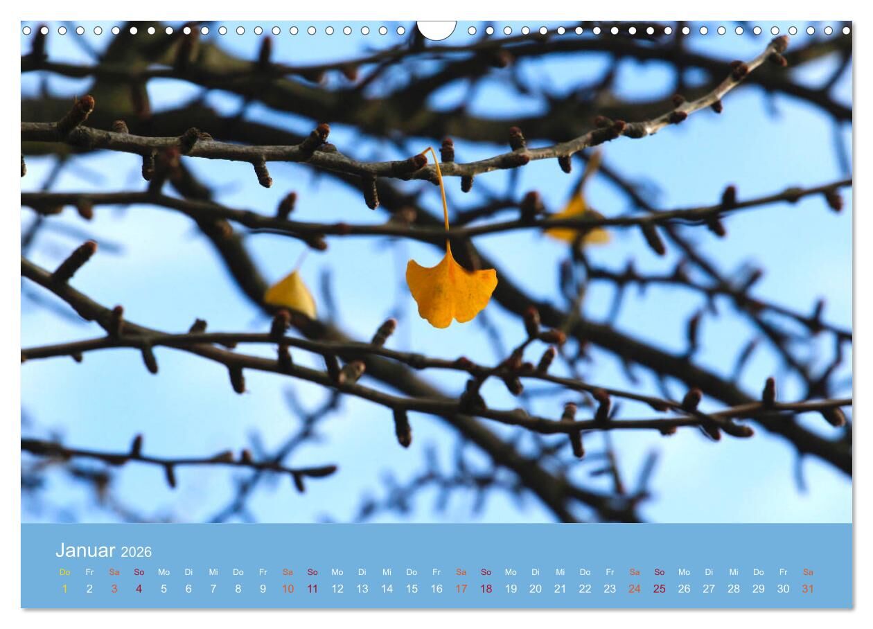 Ein Kalender mit Farbaufnahmen vom Ginkgobaum. Dieser schöne Baum mit seinen aparten, herzförmigen Blättern ist in China heimisch. Er wird hierzulande seit dem 18. Jahrhundert angepflanzt. Der Ginkobaum verliert im Winter seine Blätter. Er findet auch in der M...