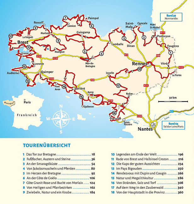 TOURENKARTEN Über 3500 km in 18 Touren durch die Bretagne entlang der Küste sowie durch das Landesinnere. Zu jeder Tour zeigt eine Übersichtskarte die Fahrstrecke zu den beschriebenen Sehenswürdigkeiten und Stellplätzen. NATUR ERLEBEN, WANDERN Bizarre Felsform...TOURENKARTEN Über 3500 km in 18 Touren durch die Bretagne entlang der Küste sowie durch das Landesinnere. Zu jeder Tour zeigt eine Übersichtskarte die Fahrstrecke zu den beschriebenen Sehenswürdigkeiten und Stellplätzen. NATUR ERLEBEN, WANDERN Bizarre Felsformationen an der Rosa Granitküste, schroffe Felsklippen und Leuchttürme im wilden Atlantik sowie verwunschene Pfade in der Brocéliande bieten eine perfekte Kulisse für traumhafte Wanderungen und familienfreundliche oder anspruchsvolle Radtouren. KULTURSCHÄTZE, STÄDTE Windschiefe Fachwerkhäuser und verwinkelte Gassen in pittoresken Orten. Menhire, Dolmen und Steinkreise, die zu den Ursprüngen der Menschheit führen. Ehrwürdige Kathedrahlen, imposante Burgen und umfriedete Pfarrbezirke, die beeindrucken. BADEN, SCHAUEN UND GENIESSEN Ruhige Bäche und rauschende Flüsse, faszinierendes Spiel der Gezeiten, türkisfarben schimmerndes Wasser vor kilometerlangen und weißen Sandstränden, steile Landspitzen und Klippen mit atemberaubenden Aussichten am Ende der Welt, dem Finis Terrae. WOMO-Service Genaue Anfahrtsbeschreibungen und GPS-Daten zu Tagesparkplätzen und 366 freien und offiziellen Stell-, Bade-, Picknick- und Wanderparkplätzen sowie Campingplätzen und Servicestationen (Strom, Ver- und Entsorgung).
