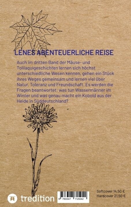 In Band 3 der Reisegeschichten von Mäusen und Tolilaquis geht es wieder um eine Reise. Ein Koboldmädchen verlässt ihr Zuhause und ihre Familie in der Heide um neue Wesen kennen zu lernen. Schon bald trifft sie auf eine Wölfin, die in den Schwarzwald auswandern...