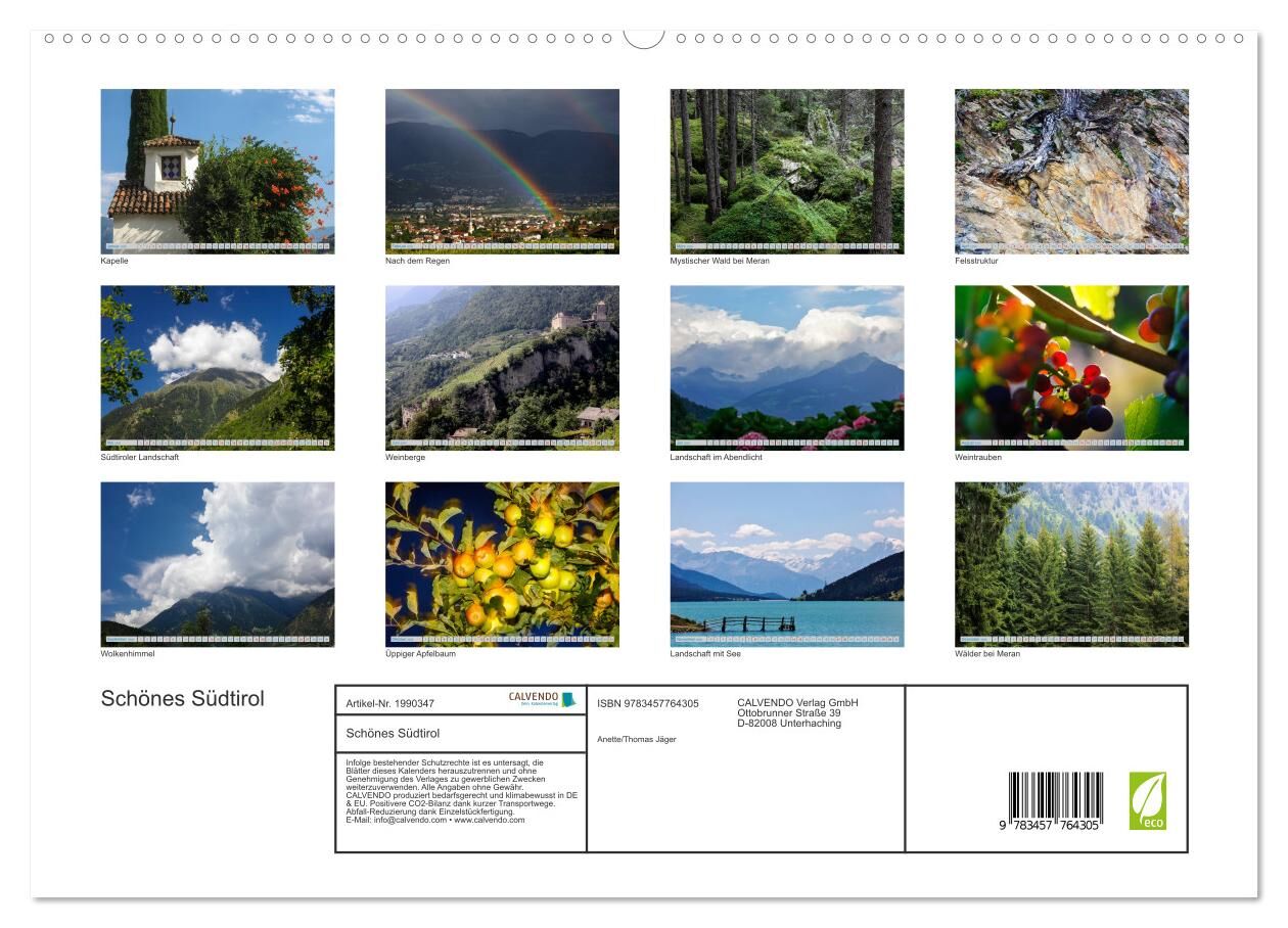 Ein Kalender mit farbigen Fotografien aus Südtirol. Südtirol ist eine wunderbare Gegend im Norden Italiens, die zum Wandern und Genießen einlädt. Schöne Landschaften, tiefe Wälder, Kunst und Kultur erfreuen den Besucher ebenso wie gutes Essen und feine Weine. ...