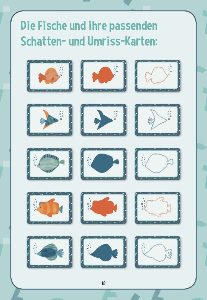 Welcher Fisch passt? Lustiges Denk- und Legespiel. Erkennen, wahrnehmen, zuordnen: Zu welchem Schattenbild gehört der Fisch? Welcher Fisch hat eine große Flosse? Welcher hat einen Bart? Schwimmen denn im Aquarium lauter gleiche Fische herum? In diesem lustigen...