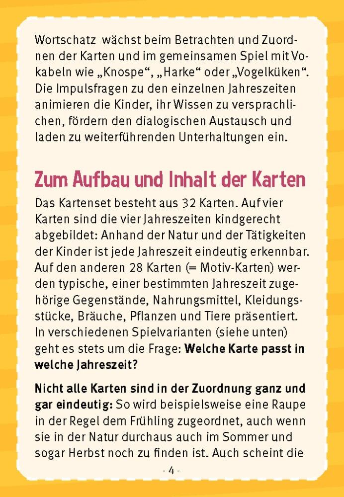 Hinsehen, überlegen, zuordnen: Die vier Jahreszeiten spielerisch kennenlernen. Lernspiel mit Bildkarten zur Sprachförderung für Kita und Vorschule. Frühling, Sommer, Herbst und Winter: Was ist typisch für welche Jahreszeit? Zu welcher Zeit im Jahr trägt man ei...