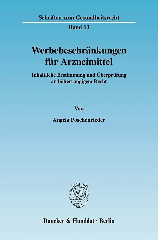 Der Bereich der Arzneimittelwerbung erfährt in Deutschland und in Europa eine starke Regulierung. Die Einschränkungen der Arzneimittelwerbung durch nationale und europäische Vorschriften basieren vorrangig auf der Einstufung von Arzneimitteln als besonders gefährliche Verbrauchsgüter, somit vorrangig auf Erwägungen des Gesundheitsschutzes. Besonders die Gefahr der Selbstmedikation durch Patienten wird als Argument für eine starke Verkürzung der Werbefreiheit in diesem Bereich angeführt. Am Arzneimittelmarkt tangieren die Werbebeschränkungen unterschiedliche, zum Teil einander entgegenstehende Interessen: Die Interessen der Verbraucher, der verschreibenden Ärzte, der beratenden Apotheken, der Krankenkassen und der Arzneimittelindustrie. Angela Poschenrieder überprüft, ob durch die vorhandenen Vorschriften ein angemessener Ausgleich dieser Interessen gelungen ist. Wie der Untertitel verrät, wird eine systematische Einteilung, Erklärung und Bewertung der in Deutschland geltenden Werbebeschränkungen für Arzneimittel sowie eine rechtliche Überprüfung dieser Beschränkungen an höherrangigem nationalem und europäischem Recht vorgenommen. Die dogmatische Aufbereitung des Themas bildet gleichzeitig ein Beispiel für das Ineinandergreifen von nationalem und europäischem Recht anhand eines eng umrissenen Rechtsgebiets.