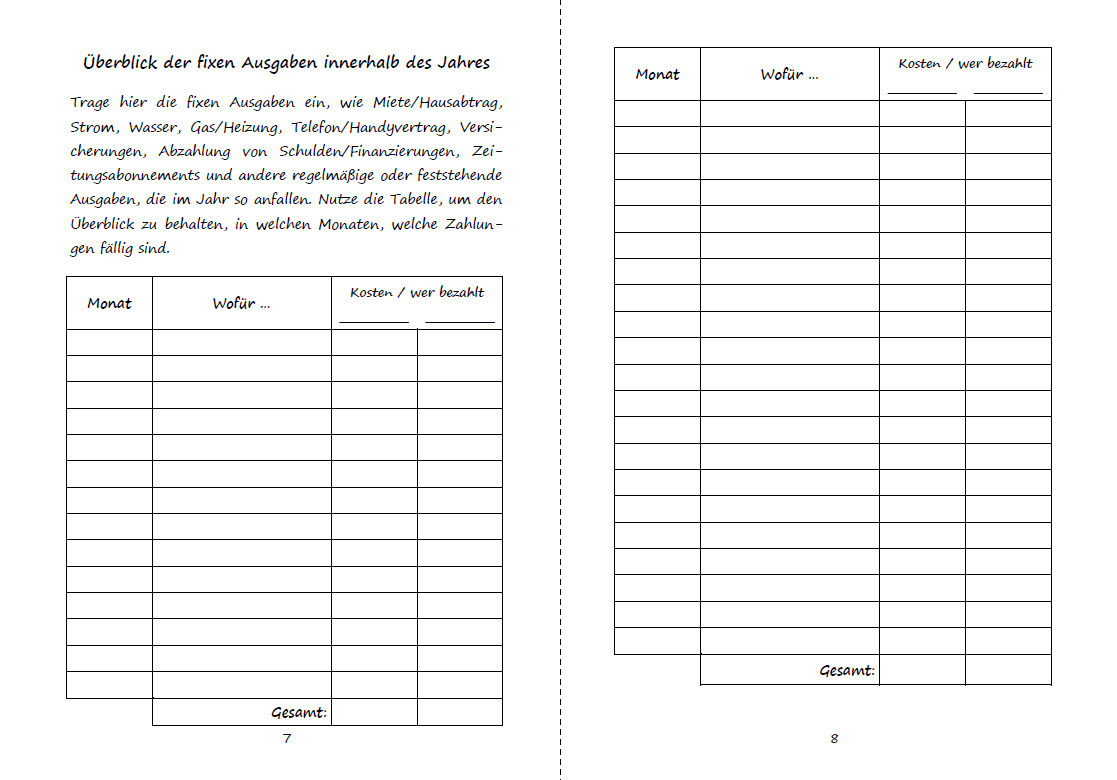 Das Haushaltsbuch für Paare zum Eintragen und Ausfüllen. Endlich den Überblick über all die Ausgaben behalten, die im Monat so anfallen und von 1 bis 2 Konten bzw. Personen bezahlt werden. Getrennte Haushaltskasse oder auch gemeinsame Haushaltskasse führen, be...