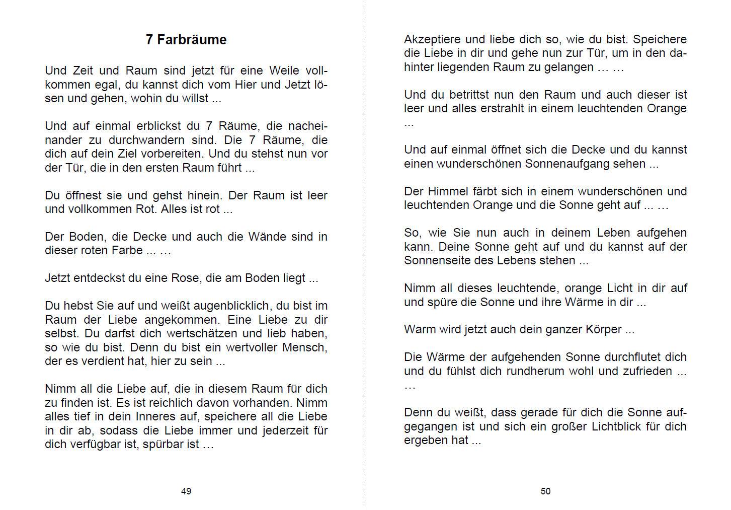 Wenn du Hypnosetexte zum Vorlesen möchtest, die dich oder deine Klienten in eine tiefe Entspannung führen und hinterher wieder zurück ins Tagesbewusstsein führen, dann benötigst du Einleitungs- und vor allem Vertiefungstexte und die dazugehörigen Ausleitungste...