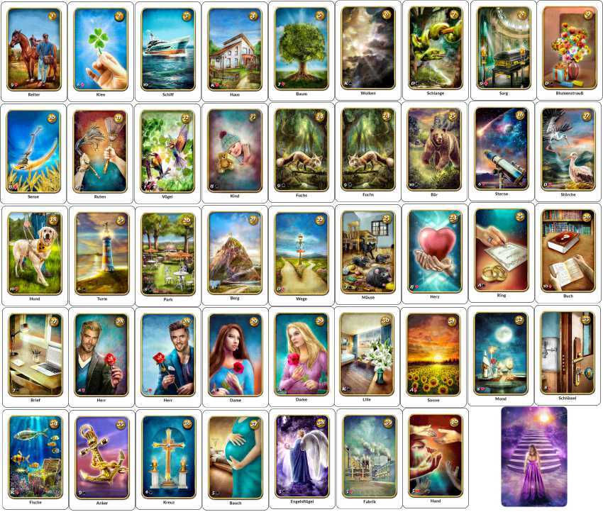 Power AO Lenormandkarten klein Kleine Größe für Unterwegs oder kleine Tische. Nur 3,9 x 5,9 cm Die Eigenschaften der Karten: Gedruckt auf 400g festem Karton Beidseitige Schutzschicht auf jeder Karte (UV-Lack, glänzend) Ecken gerundet Kartengröße 39 x 59 mm (kl...