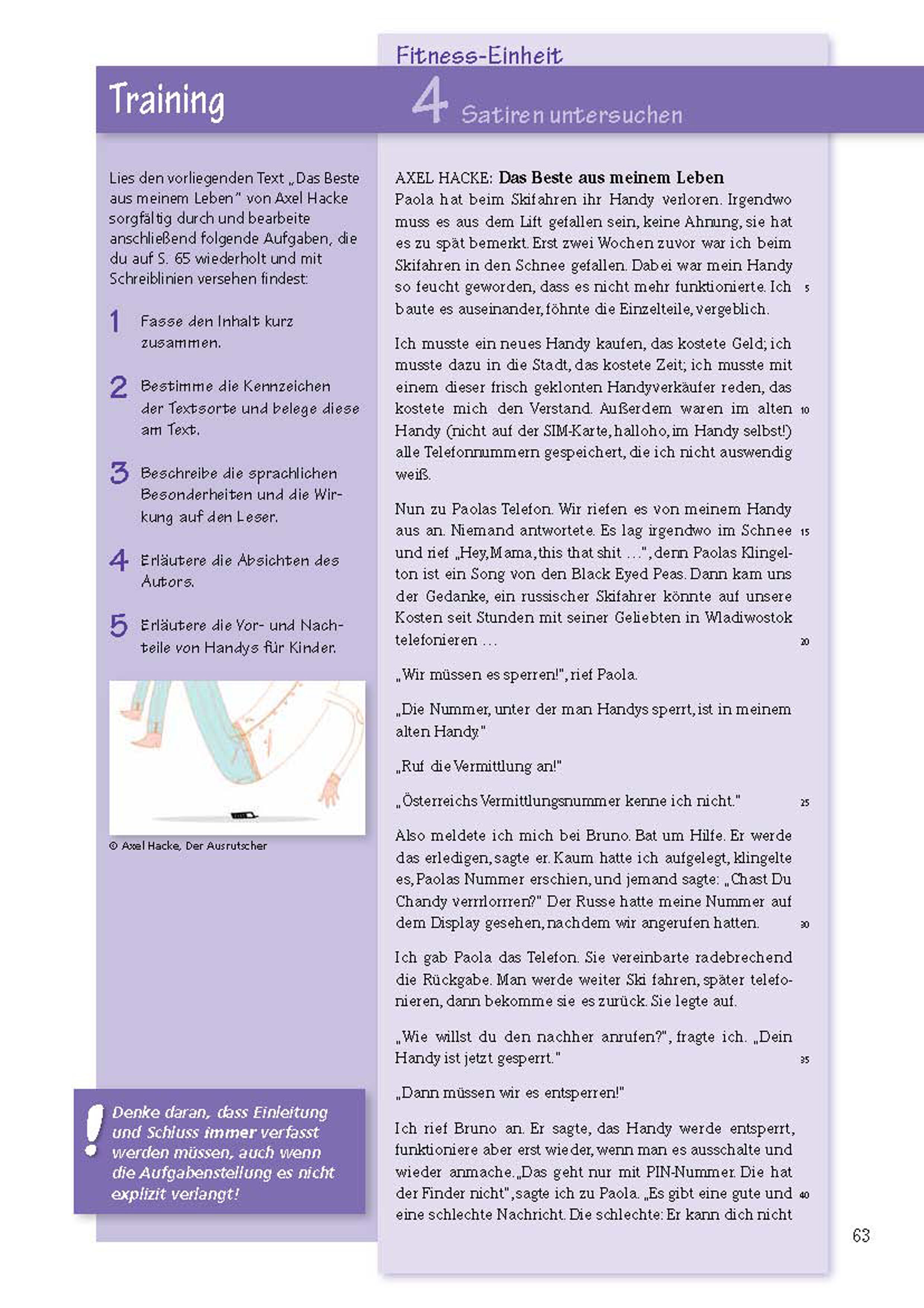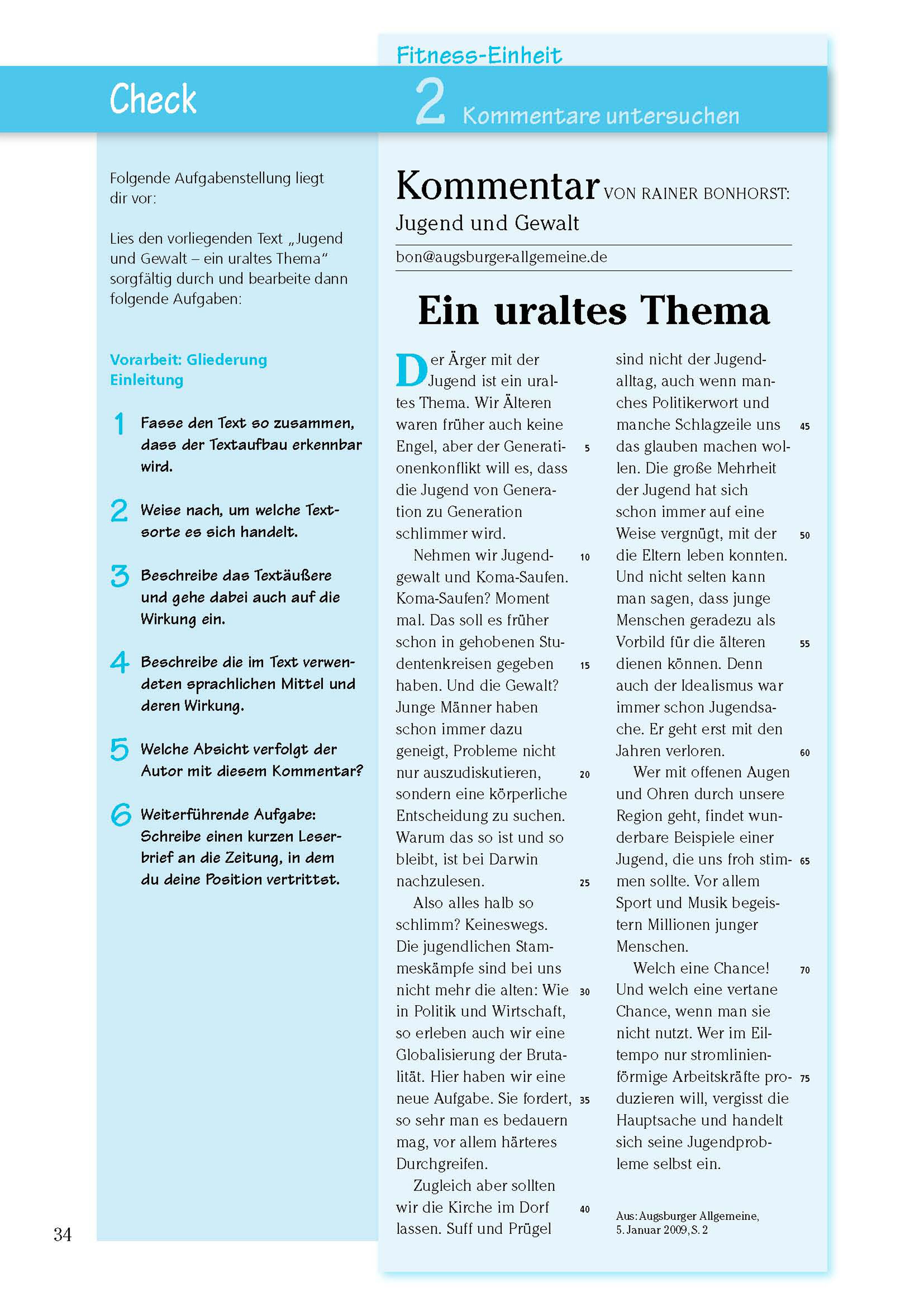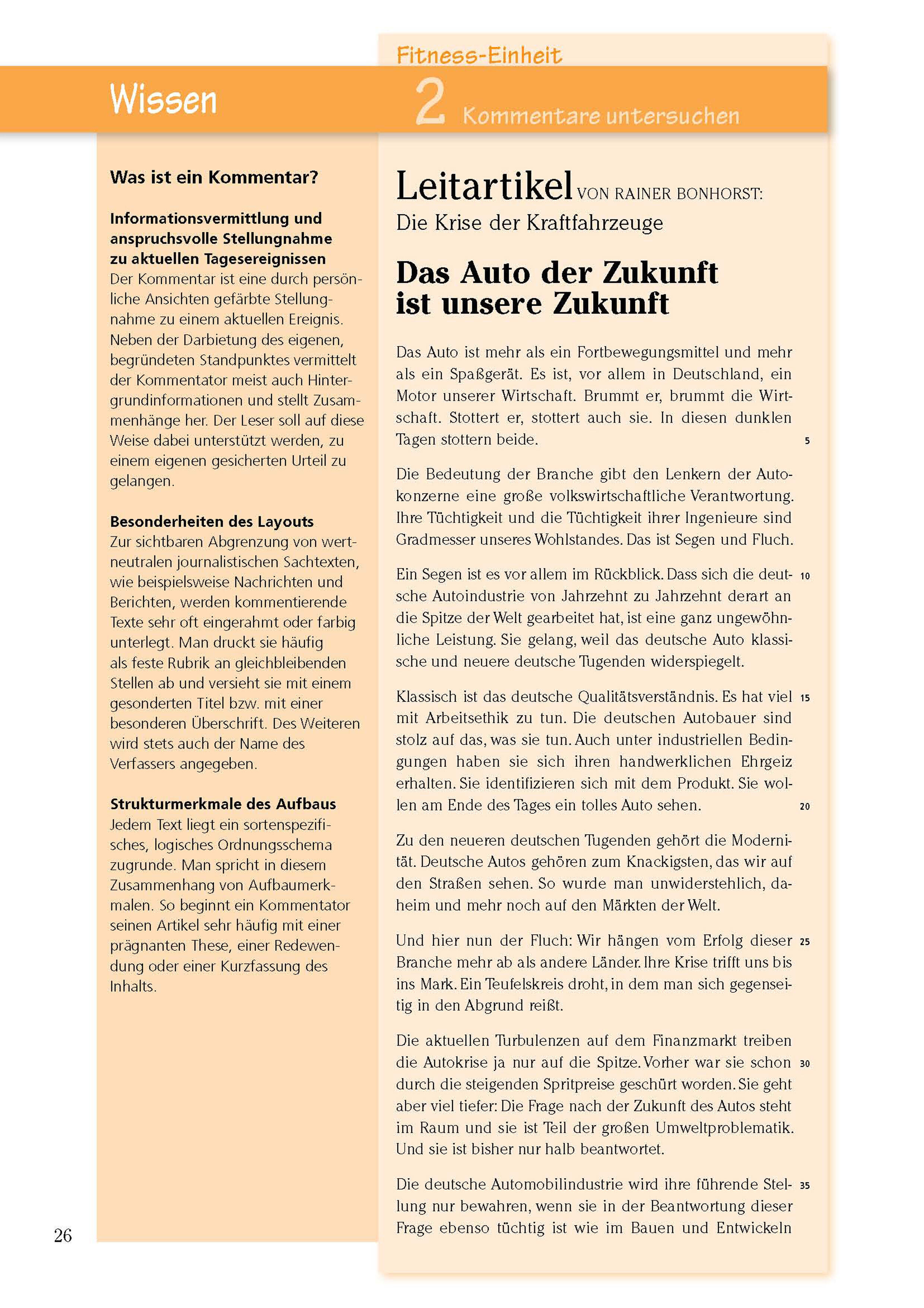 Fitness-Einheit 1 Reportagen untersuchen Fitness-Einheit 2 Kommentare untersuchen Fitness-Einheit 3 Glossen untersuchen Fitness-Einheit 4 Satiren untersuchen Fitness-Einheit 5 Kurzgeschichten untersuchen Fitness-Einheit 6 Romane untersuchen Fitness-Einheit 7 Novellen untersuchen Lösungen Anhang: Übersichten Rhetorische Stilmittel Überleitungen / Formulierungshilfen Was gehört zur Textanalyse?