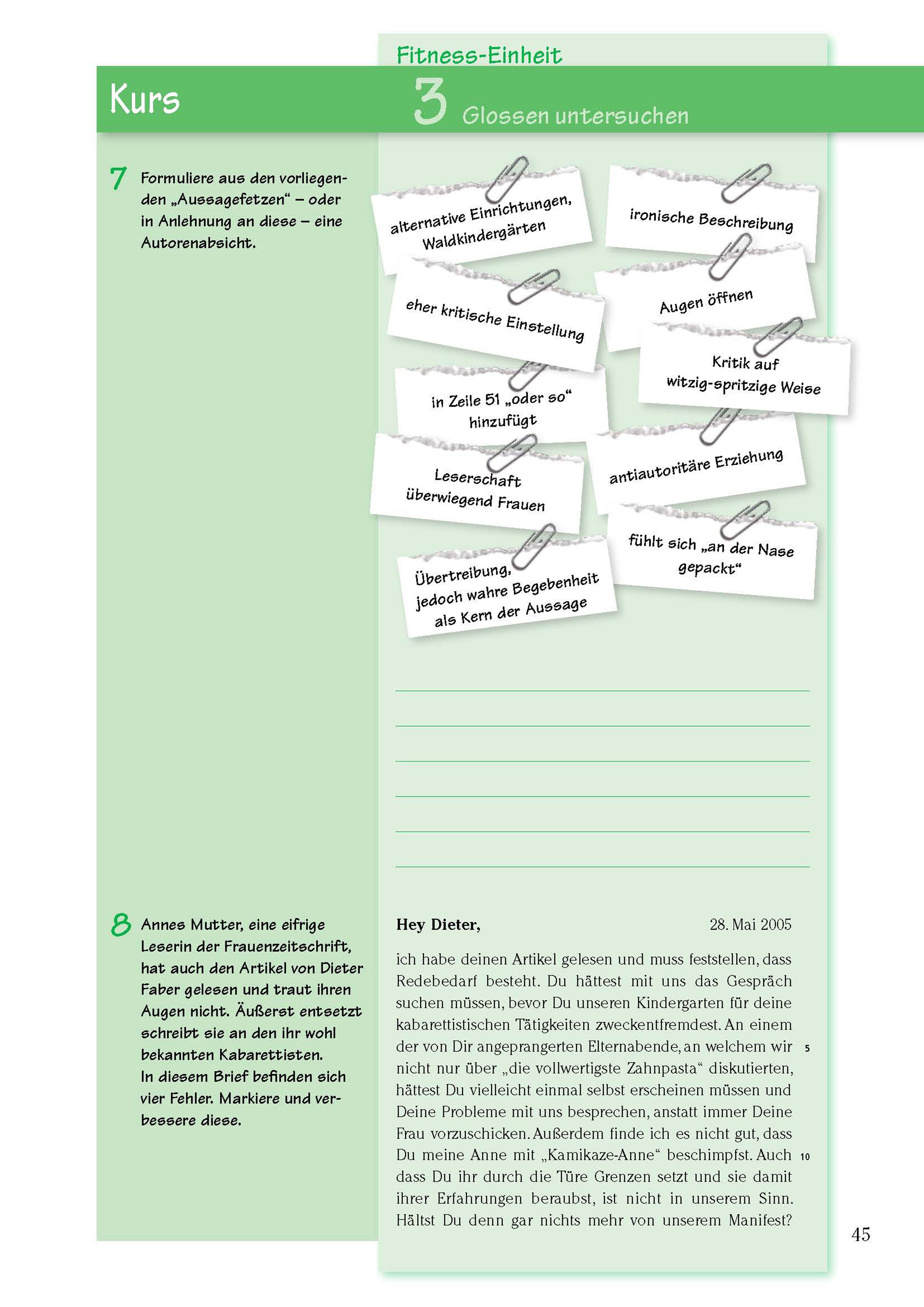 Dieser Weg wird kein leichter sein ..., dieser Songtitel trifft sicher auch auf alle zu, die ihre Deutschnote verbessern wollen. Da gibt es selten schnelle Erfolge, aber wenn du fleißig trainierst, hast du eine faire Chance - die Hanteln im Check zeigen dir, wo du stehst. Bevor du mit deinem Training beginnst, noch ein wichtiger Tipp: Viele Formalien in der Aufsatzerziehung sind nicht fest geregelt (z. B. die Abfolge der Unterpunkte in der Sprachanalyse). Frage deine Lehrkraft, wie sie es haben will. Oft wird auch vor der Klassenarbeit festgelegt, welche Textsorte zu bearbeiten sein wird. Wer hier im Gespräch mit der Lehrerin oder dem Lehrer bleibt, kann sich unnötige Arbeit ersparen und sich gezielter vorbereiten.