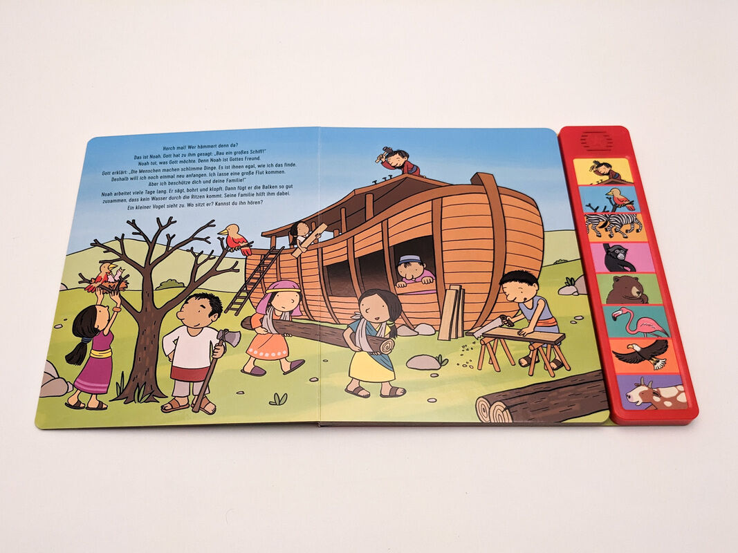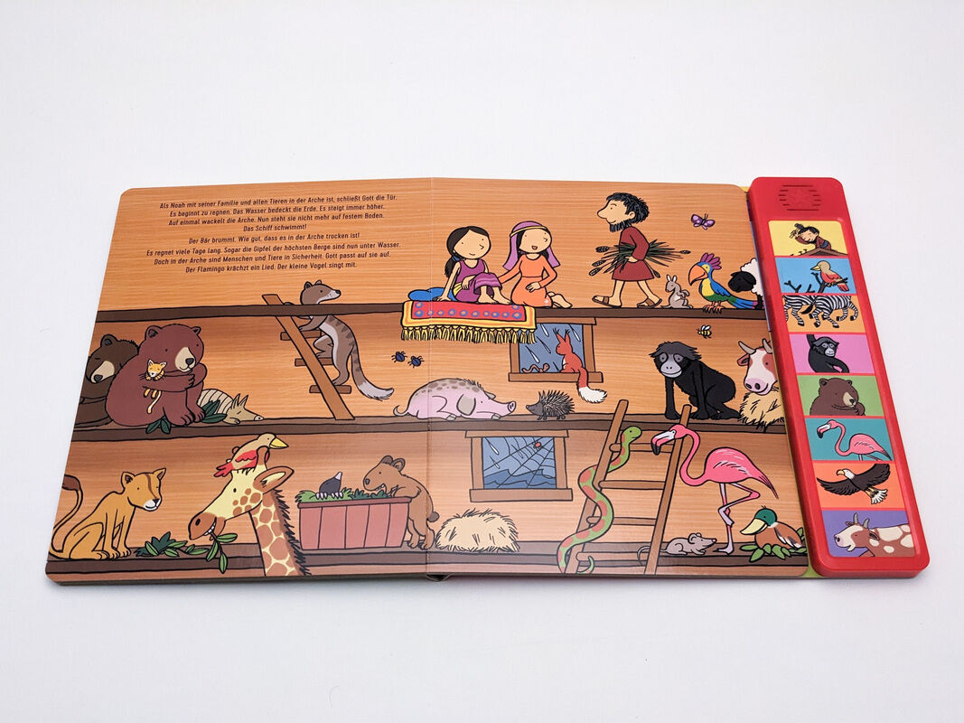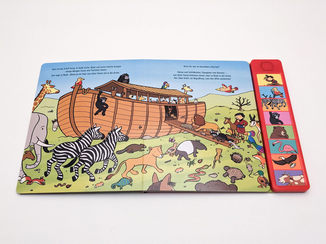 Zu jedem Bild gibt es zwei passende Geräusche. Drückt man auf den gesuchten Bildausschnitt der langlebigen Soundleiste, wird man akustisch in die Geschichte der Arche Noah hineinversetzt. Die detailliert und liebevoll illustrierten Bilder laden zum Betrachten ...