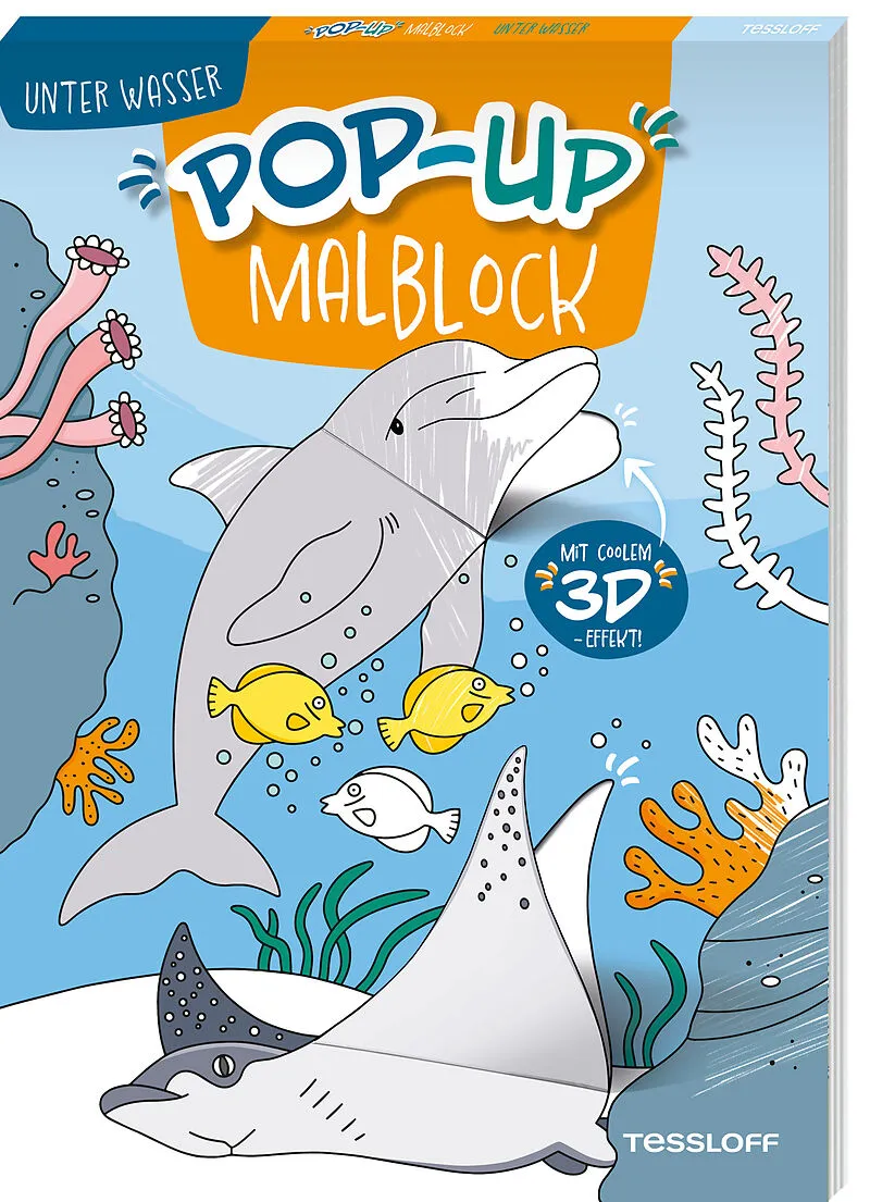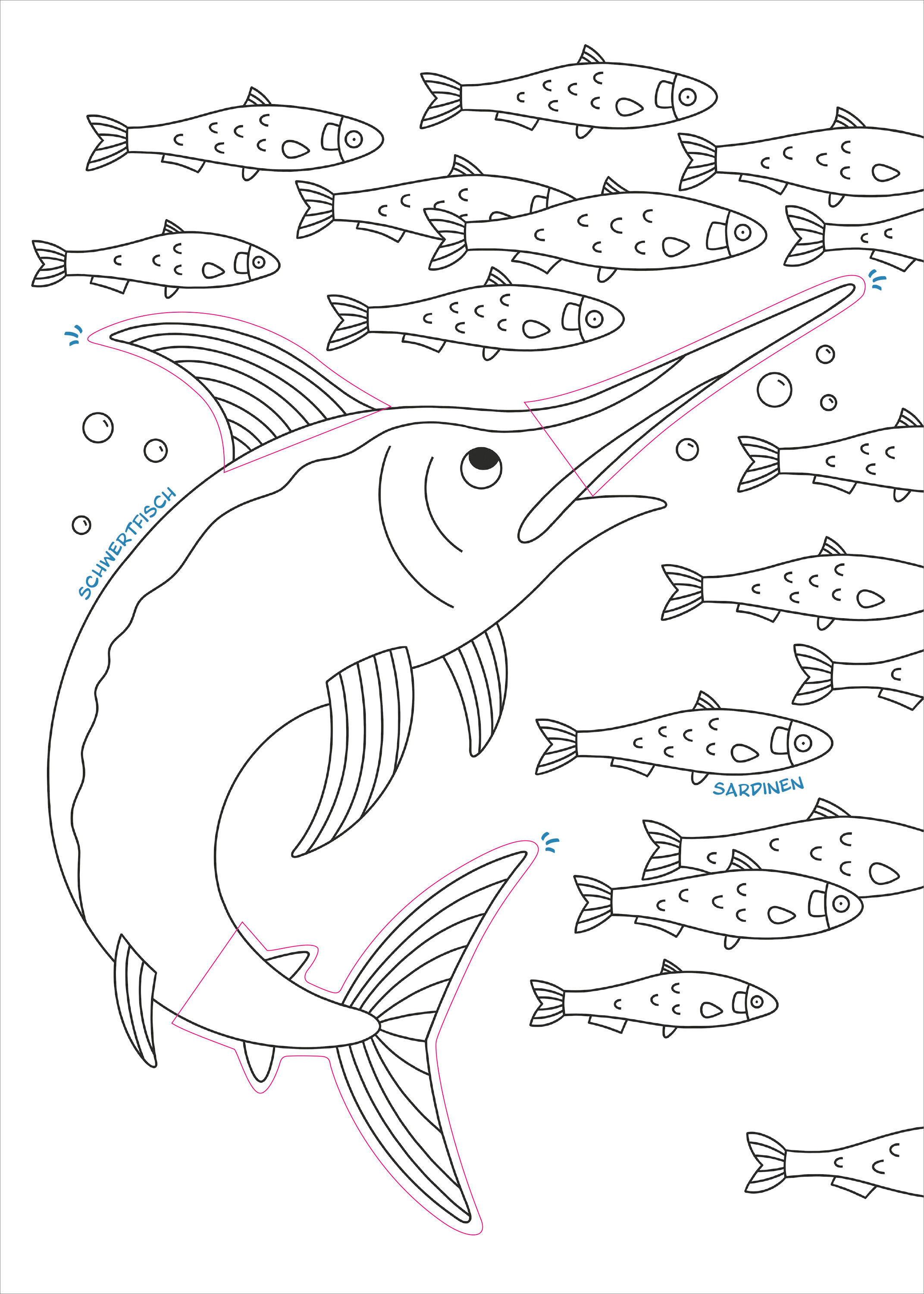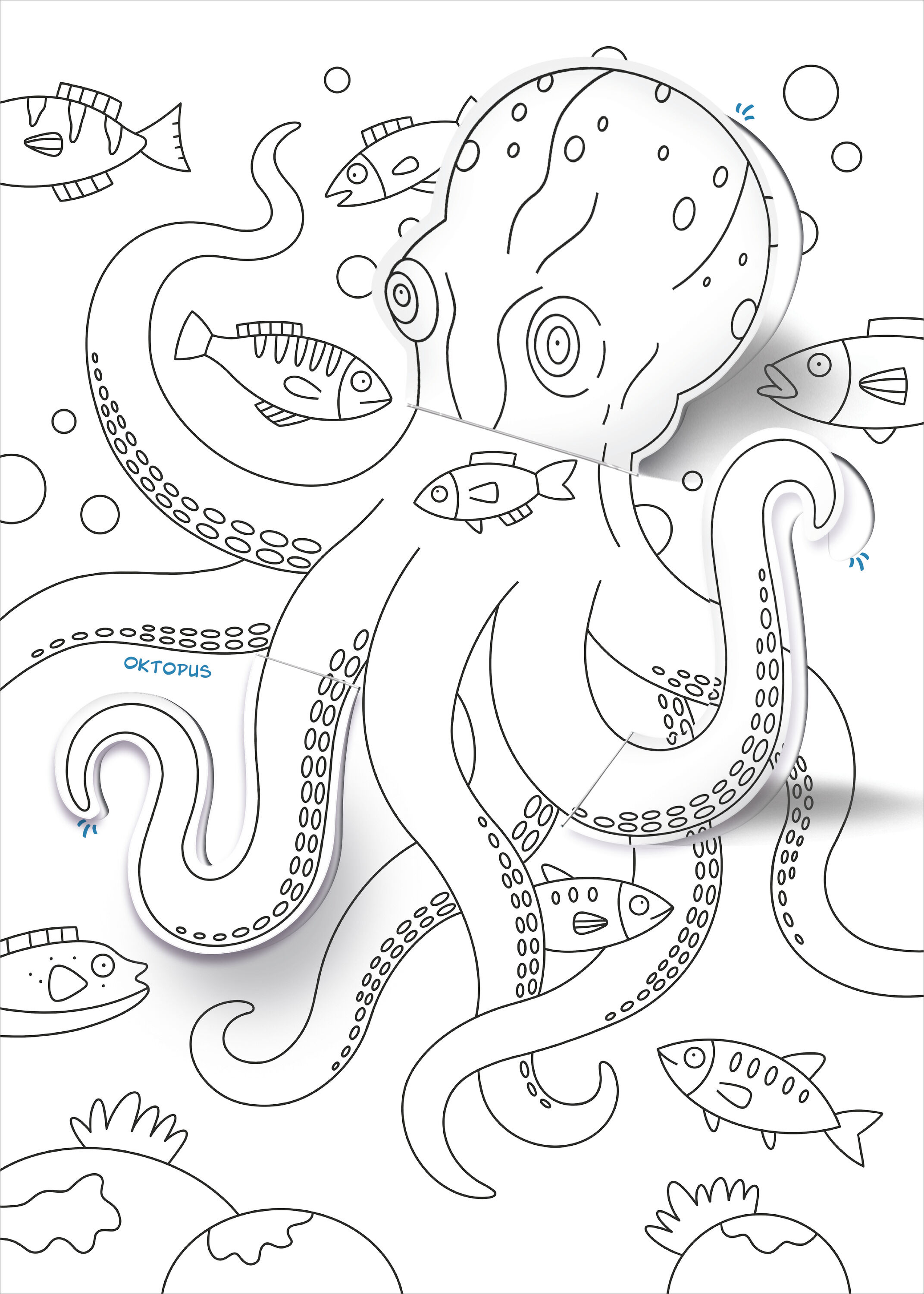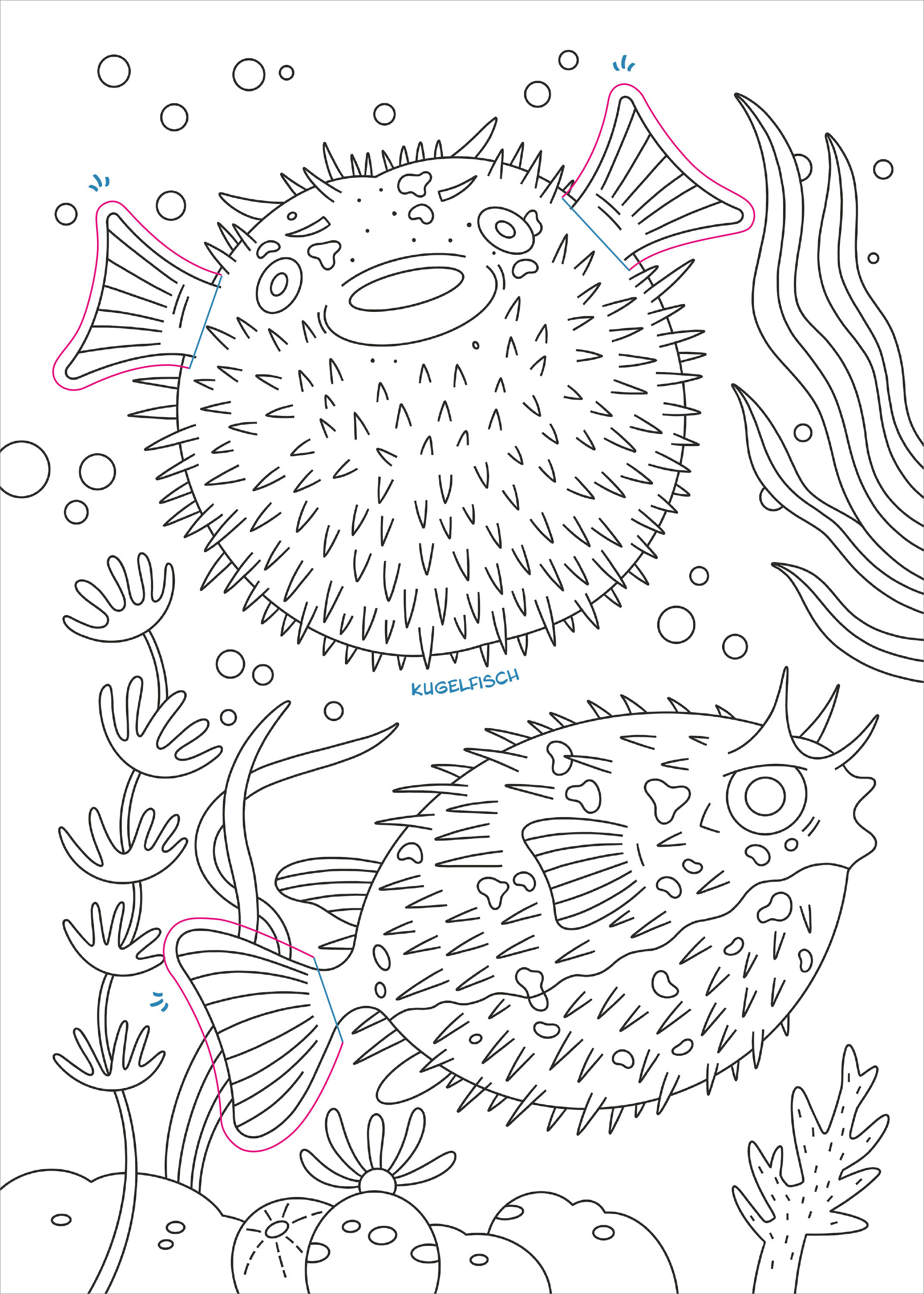 So schön bunt ist die Unterwasserwelt. Hier tummeln sich Haie, Buckelwale, Quallen, Kraken, und viele Fische. Doch nach dem Ausmalen strecken die Fische ihre Flossen aus dem Blatt heraus, die Tentakeln des Kraken kommen angekrochen und der Buckelwal wirkt gera...