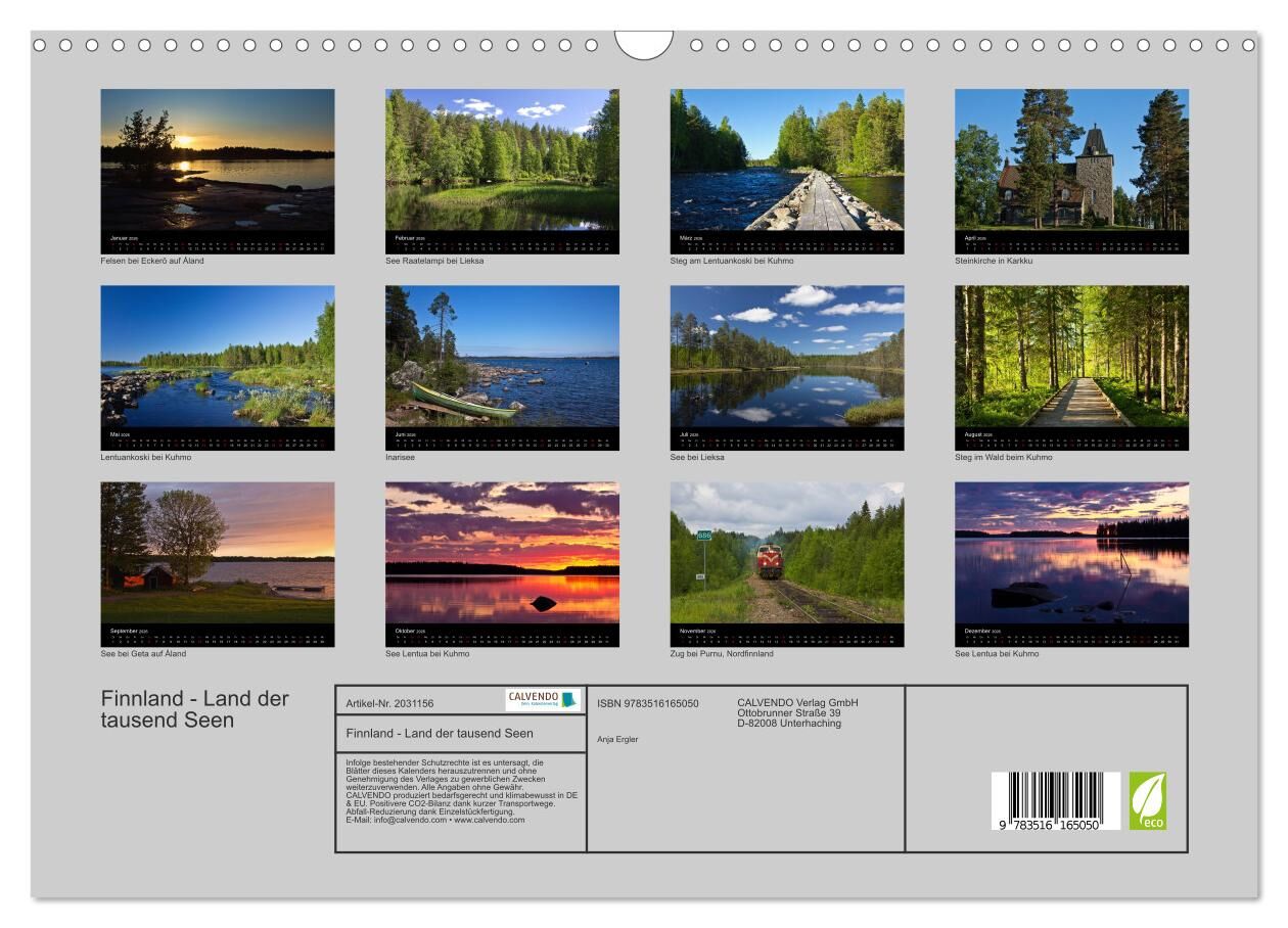Finnland - das Land der Seen und Wälder zeigt in diesem Kalender seine faszinierende Schönheit. Kommen Sie mit in das östlichste Land Skandinaviens. Genießen Sie die Ruhe an den einsamen Seen, erleben Sie die einzigartige Natur an Flüssen und in den dichten Wä...