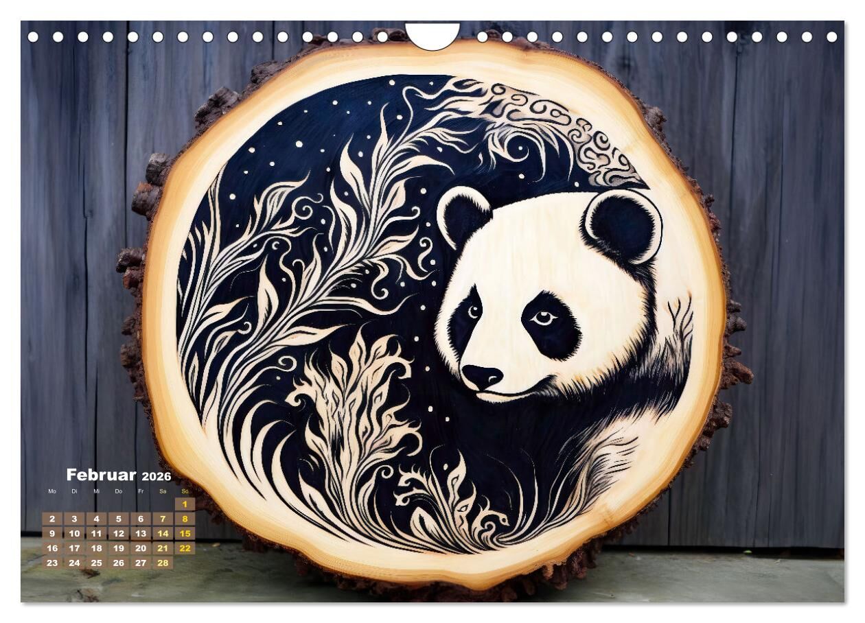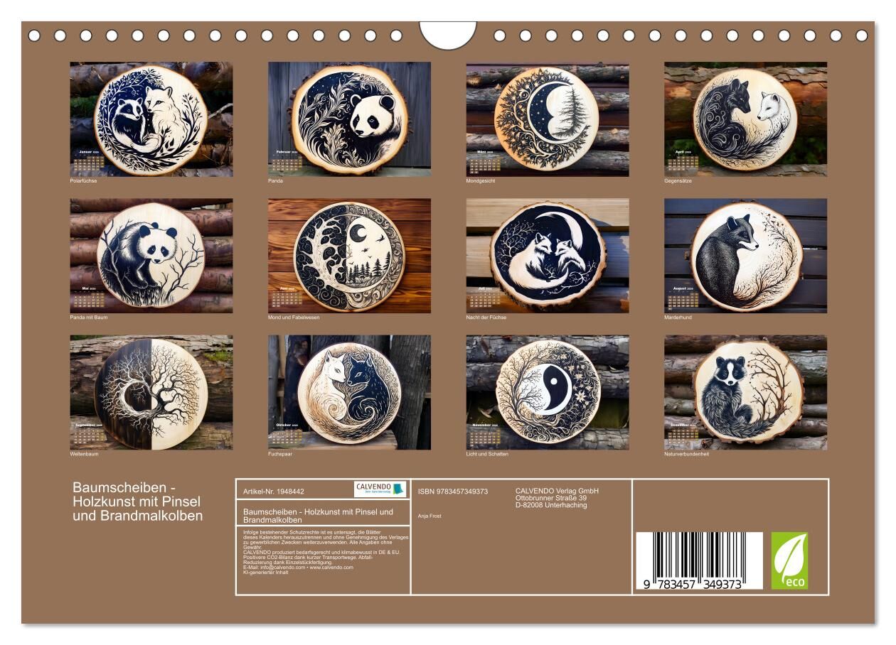 Begib dich auf eine künstlerische Reise durch die Natur mit unserem Kalender 'Baumscheiben - Holzkunst mit Pinsel und Brandmalkolben'. Jeder Monat enthüllt meisterhaft KI-gestaltete Baumscheiben, auf denen Tiere, Pflanzen und abstrakte Motive durch die Kunst v...
