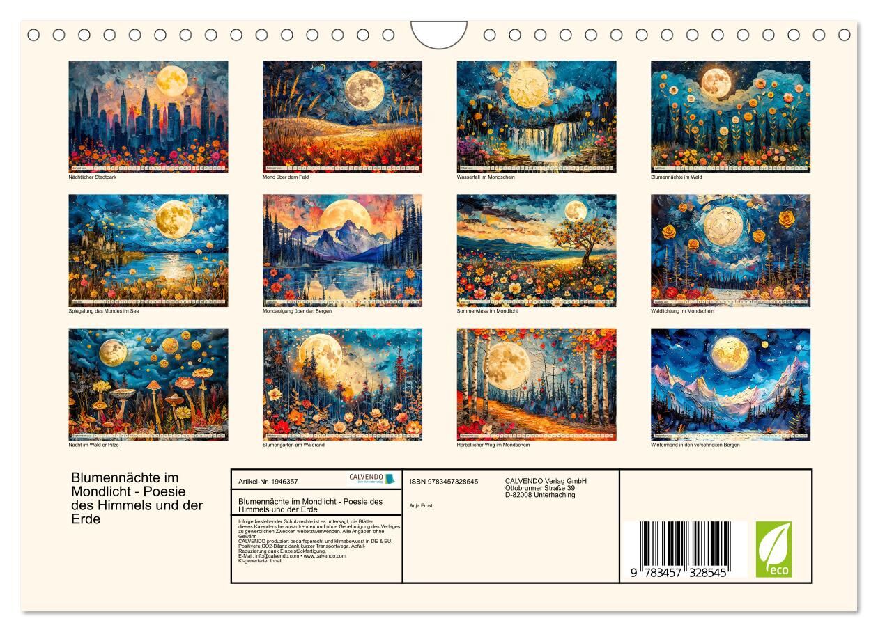 Tauchen Sie ein in eine Welt voller Magie und Romantik mit unserem einzigartigen Kalender "Blumennächte im Mondlicht - Poesie des Himmels und der Erde". Dieser wunderschöne KI-generierte Kalender bringt Ihnen die atemberaubende Schönheit von Blumenlandschaften...