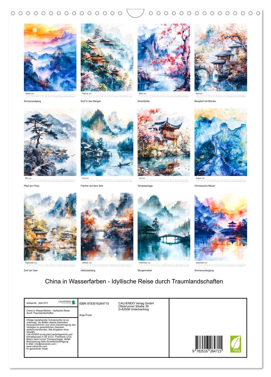 Tauchen Sie ein in die faszinierende Welt Chinas mit unserem Kalender "China in Wasserfarben - Idyllische Reise durch Traumlandschaften". Dieser atemberaubende KI-generierte Kalender zeigt die Schönheit Chinas in sanften Wasserfarben, von majestätischen Bergla...