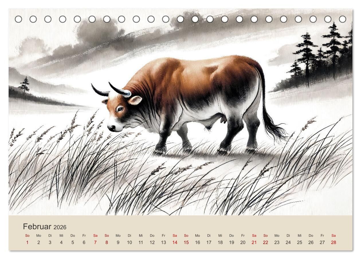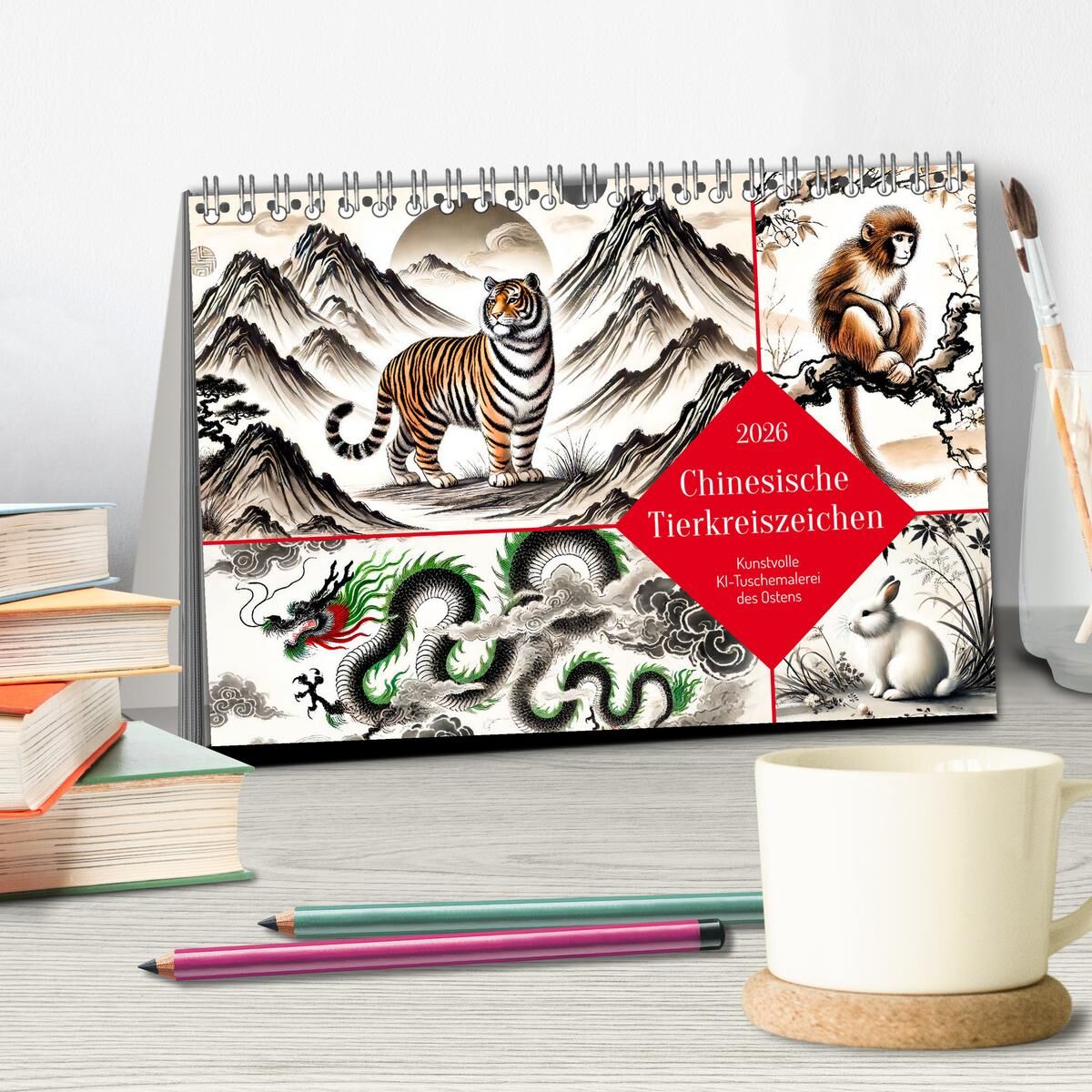 Chinesische Tierkreiszeichen - Kunstvolle KI-Tuschemalerei des Ostens (Tischkalender 2026 DIN A5 quer), CALVENDO Monatskalender